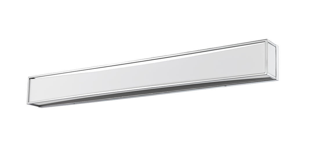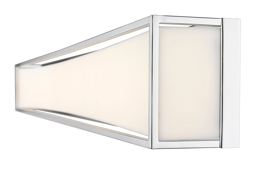 Clean and modern, this two-light vanity light showcases sleek, gleaming lines of chrome finish metal. Perfect for a powder room, it boasts a delicate, frosted white shade that diffuses the light into a soft, graceful glow.