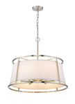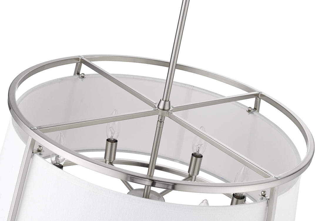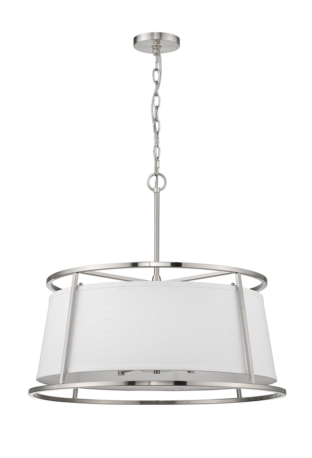 Illuminate your living space with the alluring glow of this elegant, six-light pendant. With a versatile design that works well in almost any room, this sophisticated fixture blends a brushed nickel frame with a soft, white shade for beautiful ambiance.