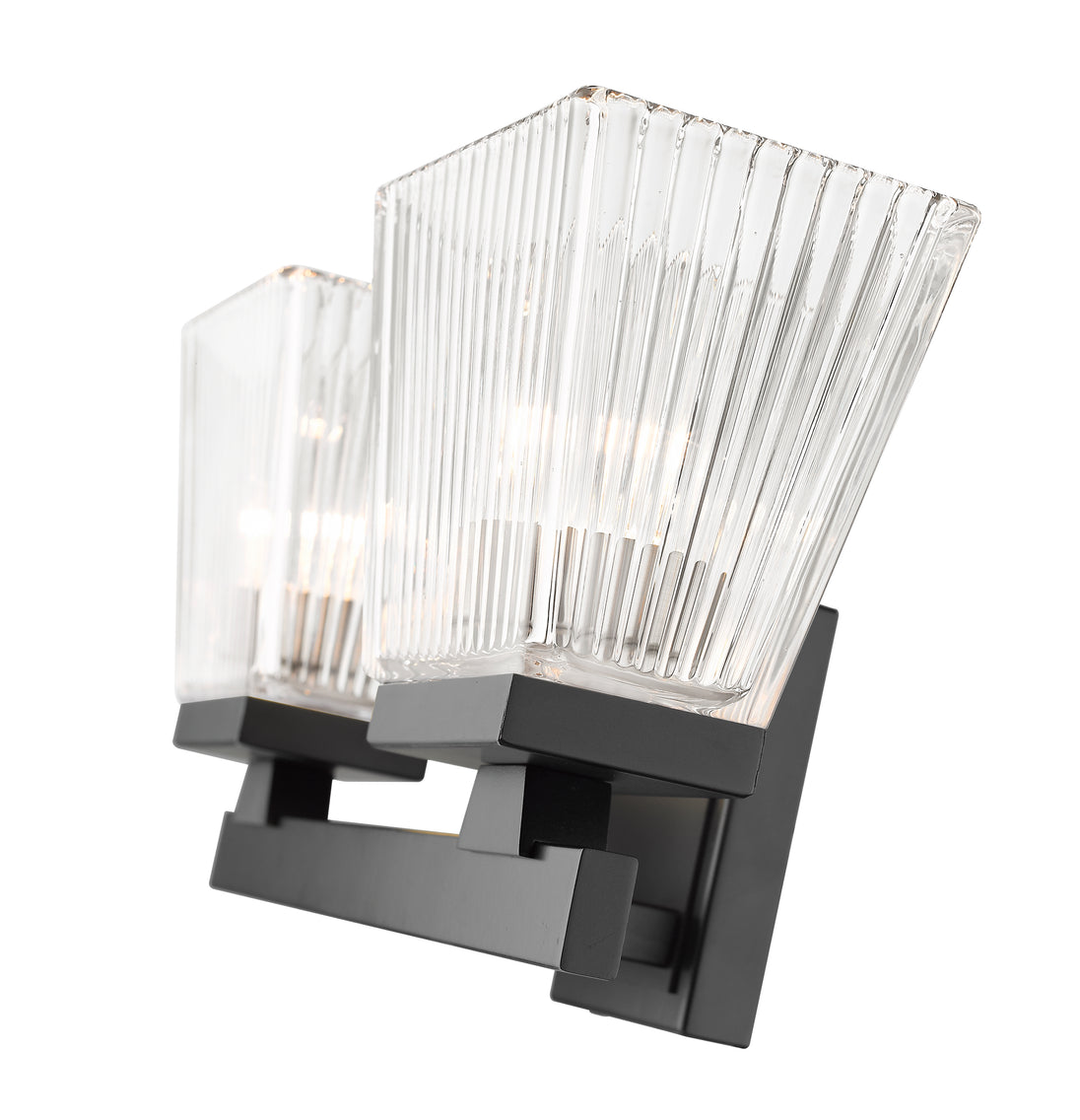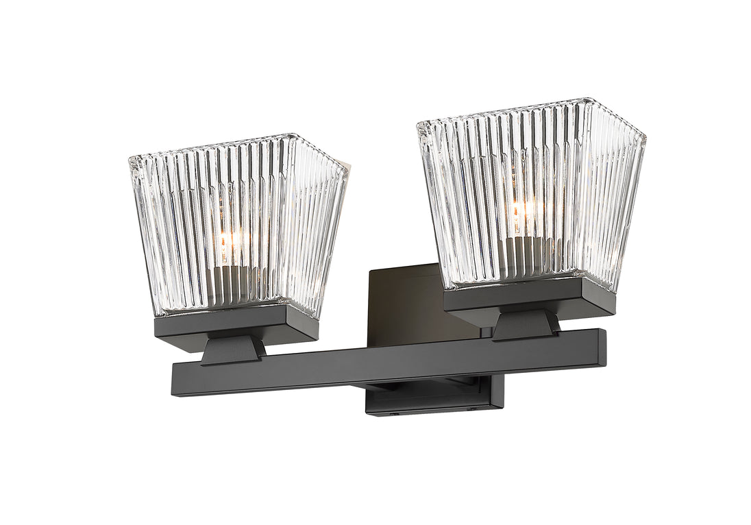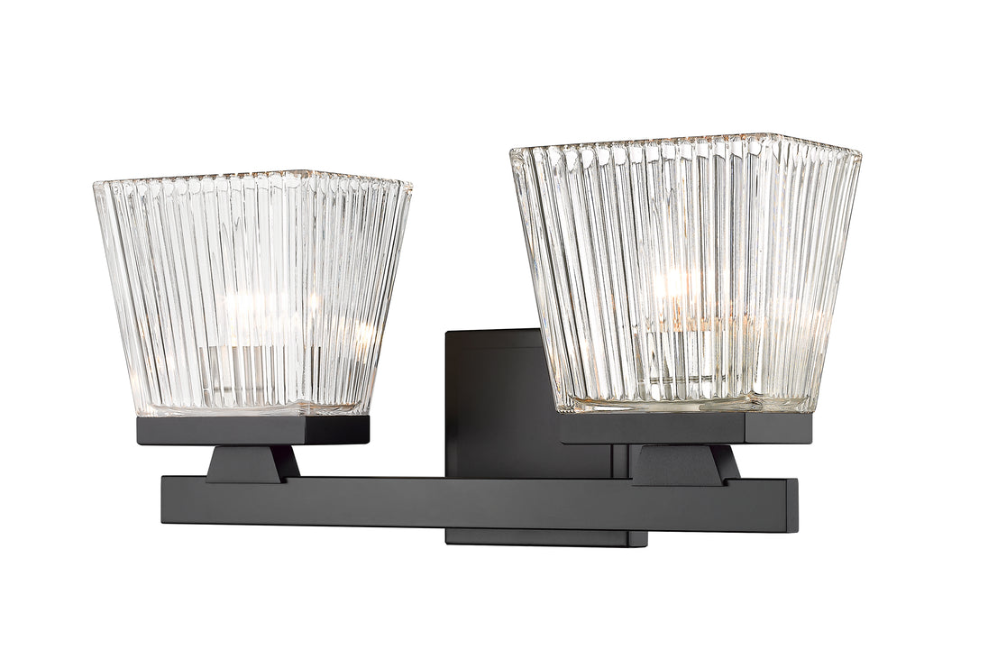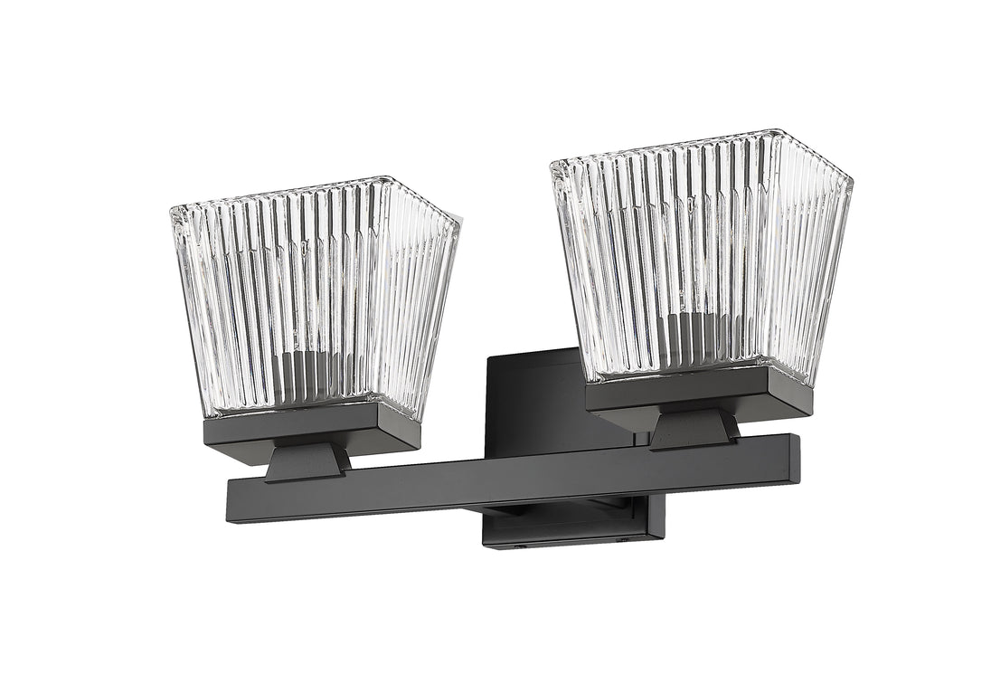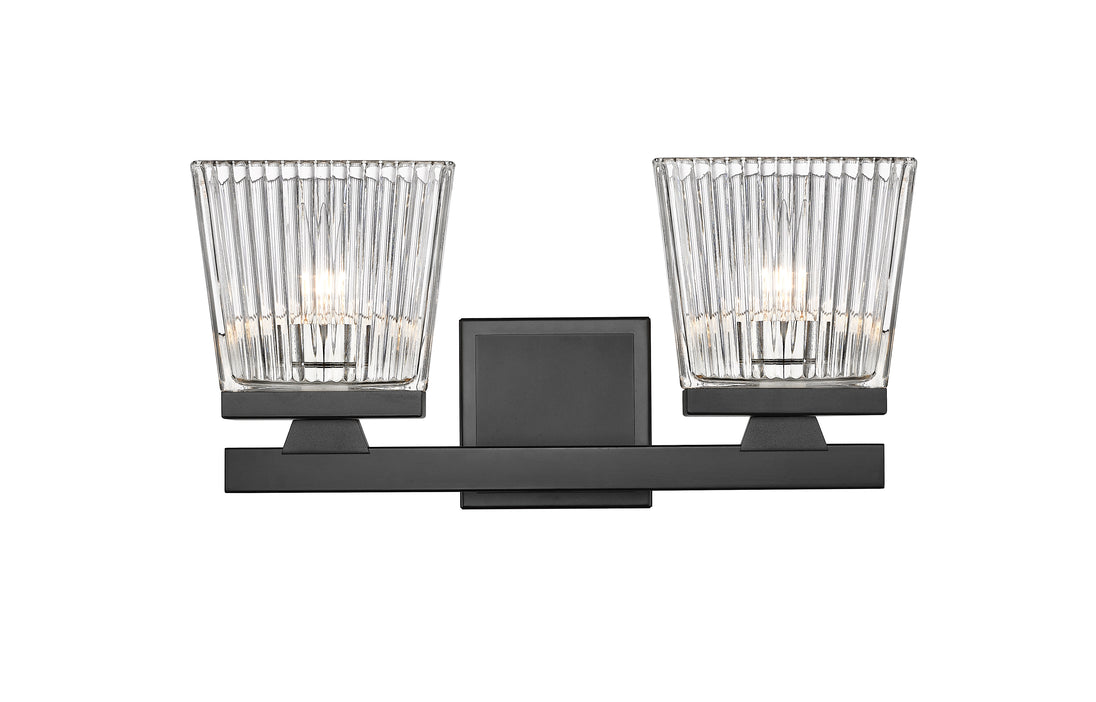 This two-light vanity light fixture in matte black is a combination of classic and modern design, suitable for farmhouse and mid-century modern decor. Captivating your attention with a clear glass shade with a ribbed texture, this piece boasts steel construction.