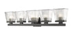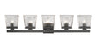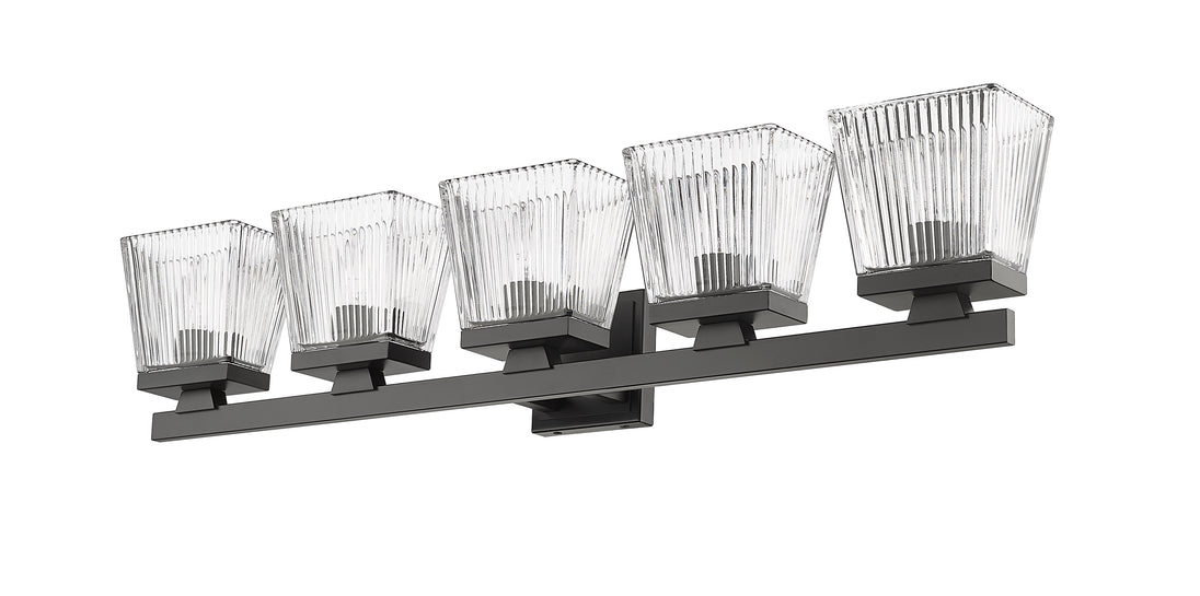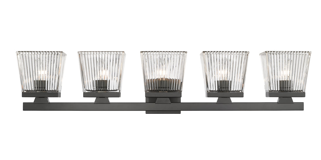 A five-light vanity light in matte black is a quick and easy way to include farmhouse-chic character to your bathroom. The clear glass shade is ribbed for additional aesthetic allure.
