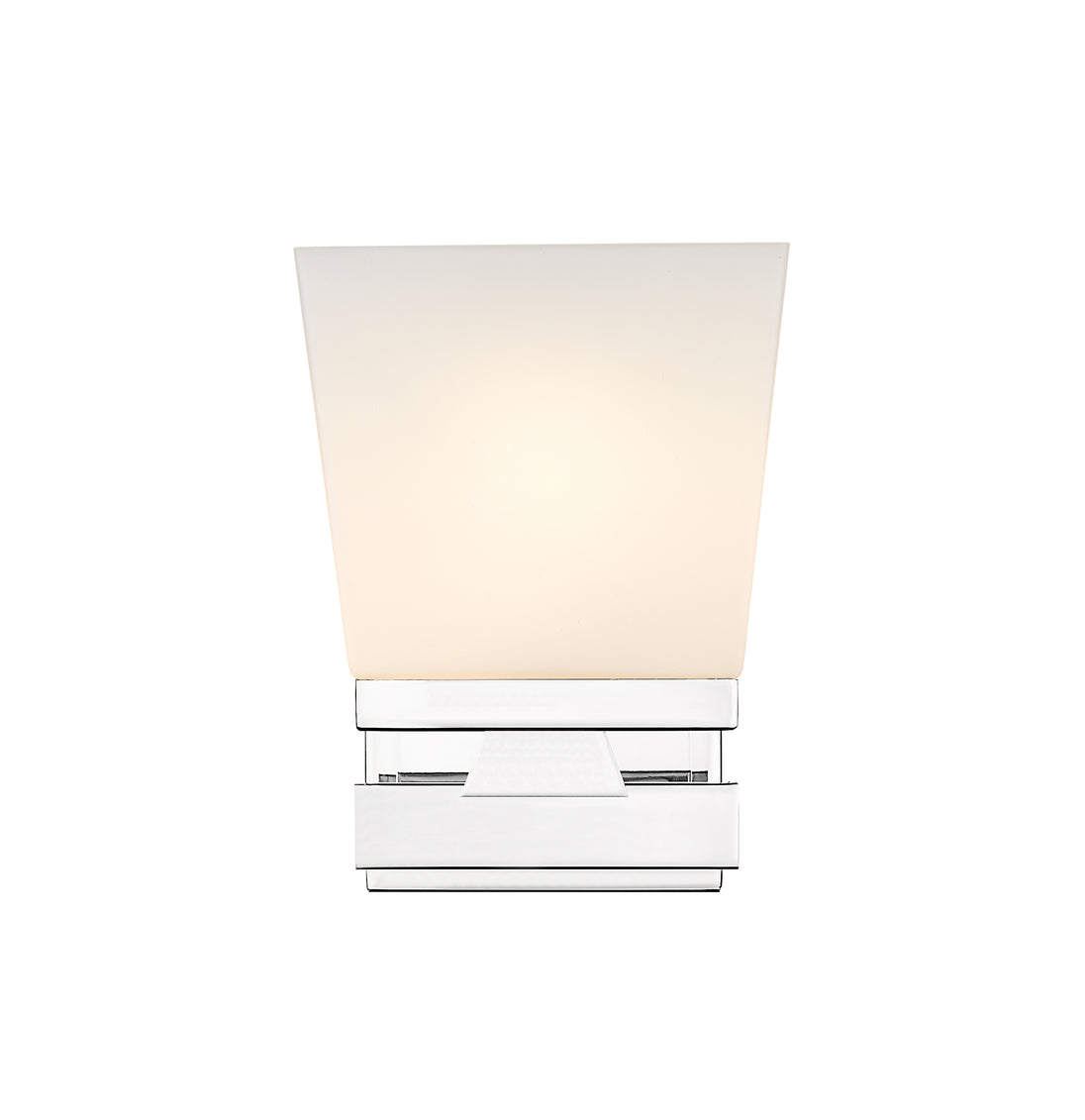 Invite modern farmhouse flair vibes into your home with a chrome wall sconce. This wall sconce showcases a glass shade in etched opal. The chrome finish contributes to the timeless appearance, while steel construction offers both style and aesthetic allure.