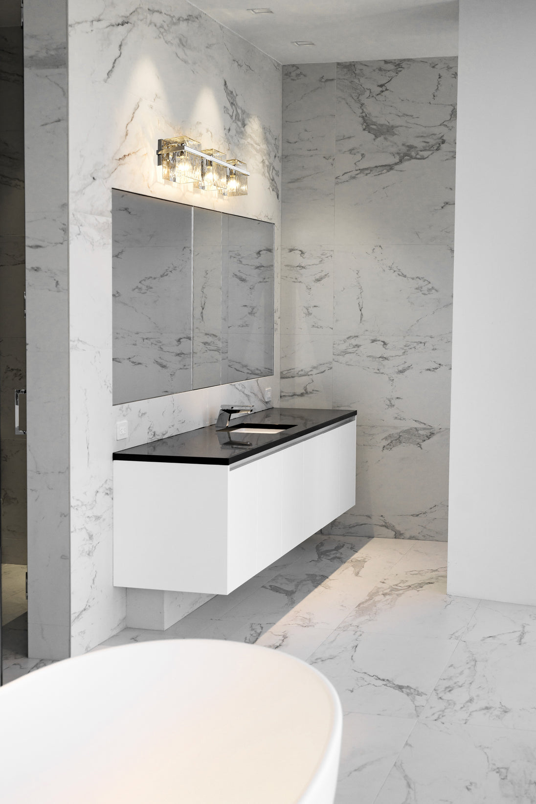 The Bennington Collection of bath fixtures highlights its handmade glass with a distinctive metal cuff for a unique artisanal appearance. A choice of rich finishes – Modern Gold, Brushed Nickel, Matte Black, and Chrome – helps set the look apart.