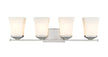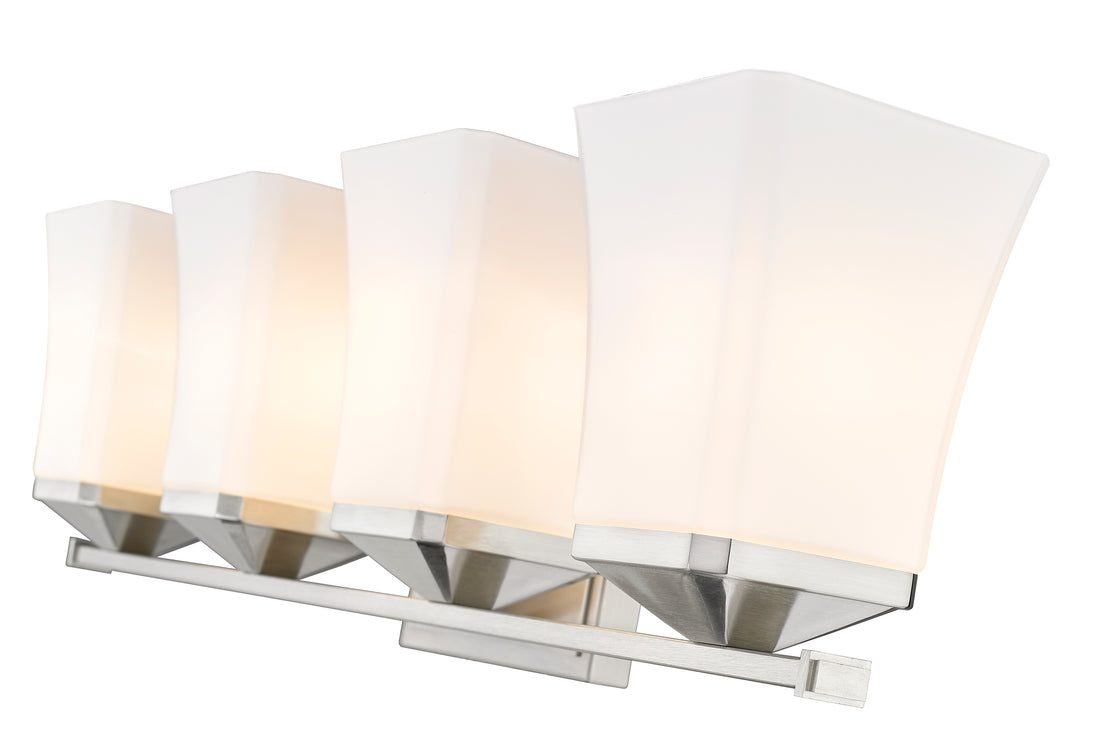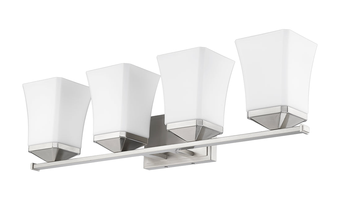 Perfect for the bath, this four-light vanity fixture boasts a flared silhouette. Providing ample lighting, the brushed nickel finish and steel construction ensure a stylish touch.