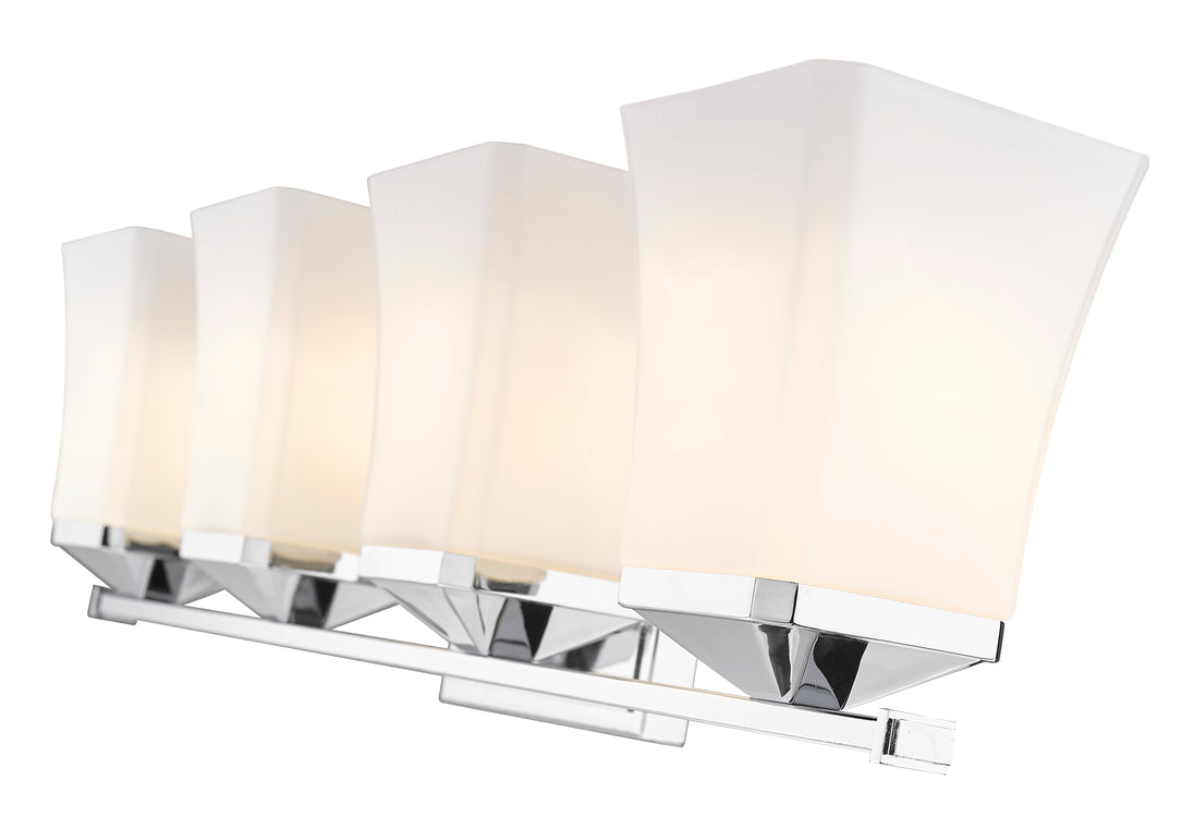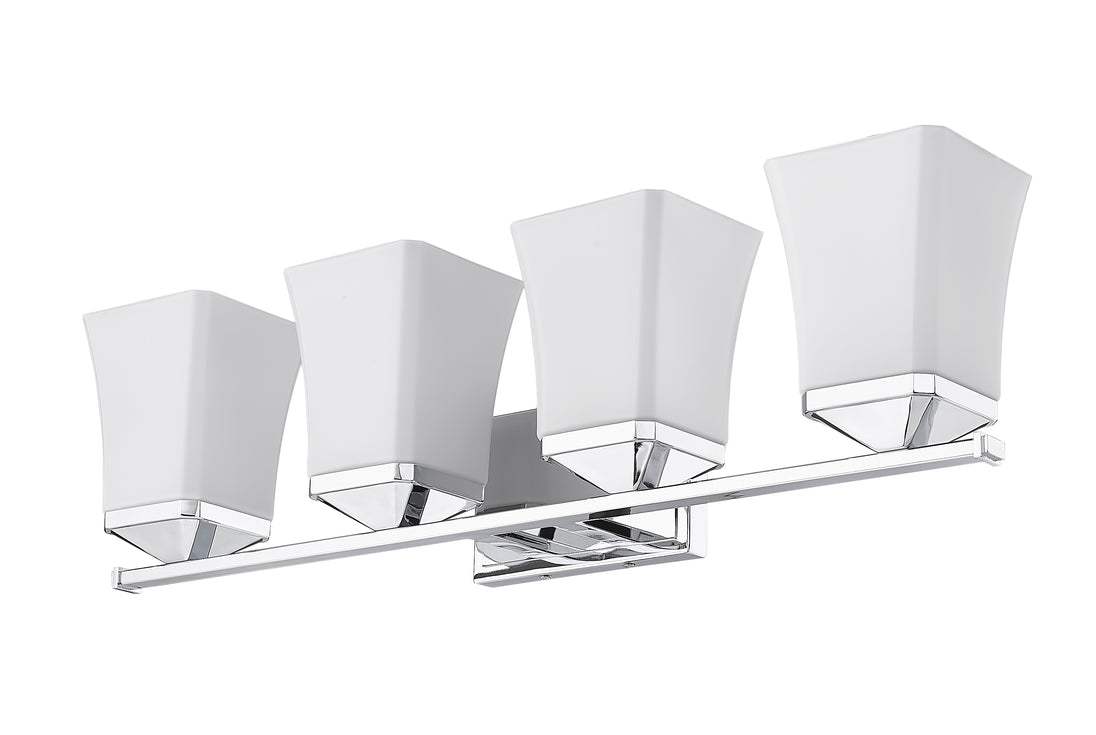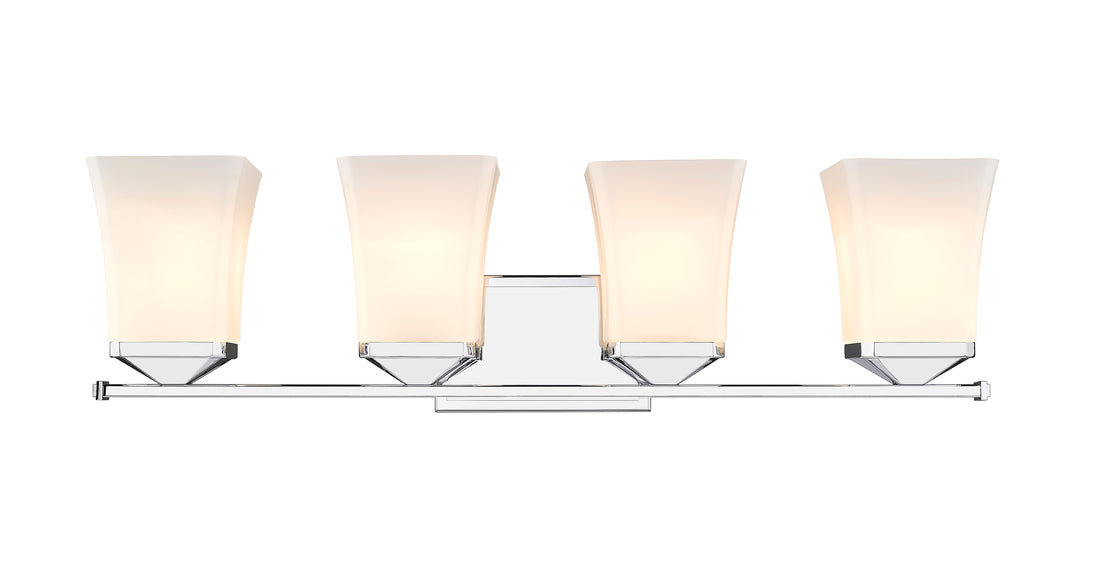 Perfect for the bath, this four-light vanity fixture boasts a flared silhouette. Providing ample lighting, the chrome finish and steel construction ensure a stylish touch.