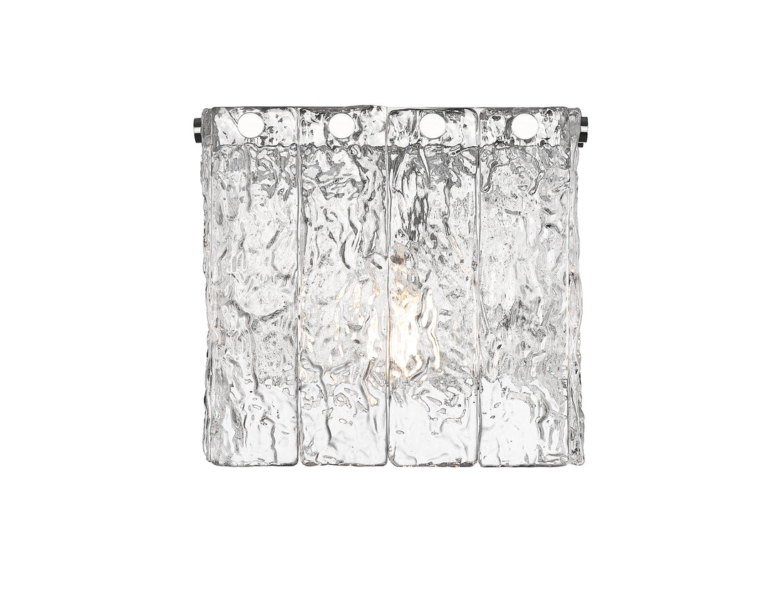 A chrome finish adds icy reflectivity and contrast to the stunning textured clear glass panels displayed on a modern one-light wall sconce. Perfect for the vanity, hall, or living room, this sconce delivers engaging character with its mélange of texture and dimensionality. The cool look of melting ice creates a strikingly bold display in your home.