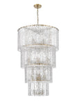 Impeccable ambiance radiates from the warm finish and icy glass featured on a modern 18-light chandelier. A bold centerpiece over a staircase or grand foyer, it boasts four round, graduated tiers that create its chic silhouette. Vertical panels of icy textured clear glass bring impeccable dimensionality, while a modern gold finish over its minimalist steel framework adds inviting warmth.