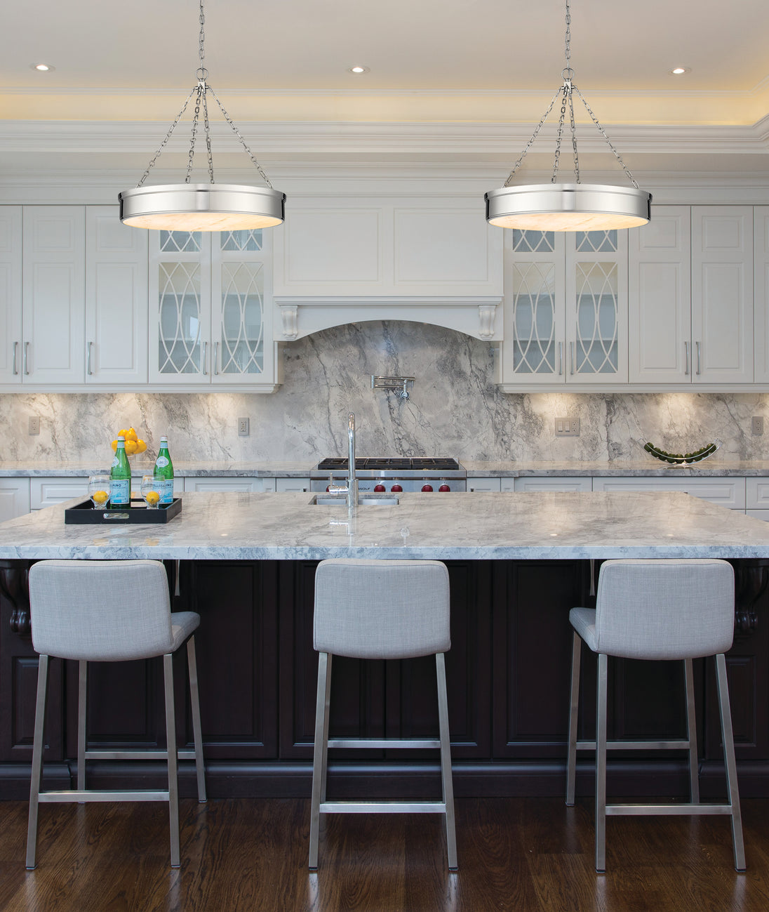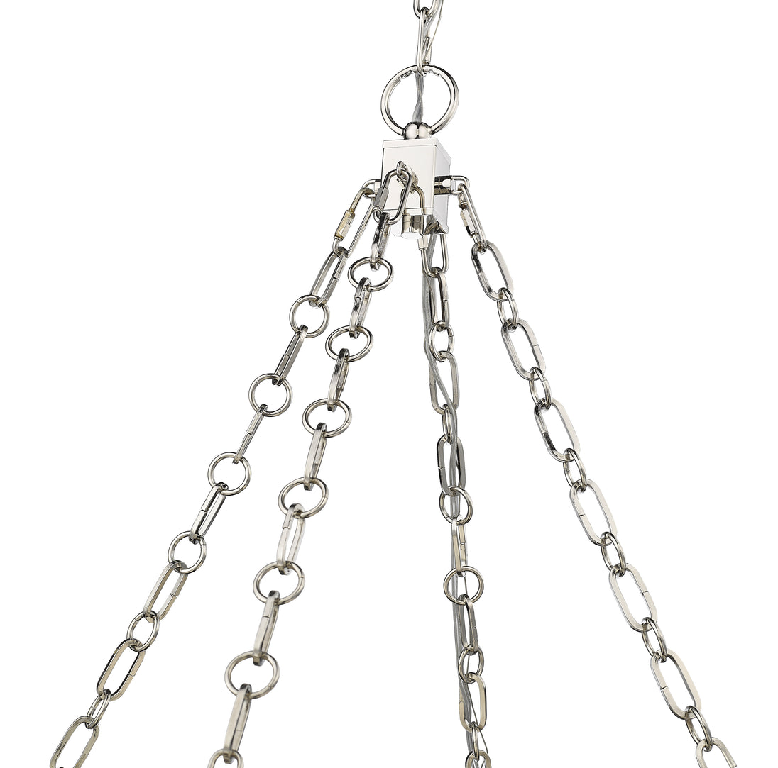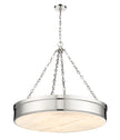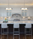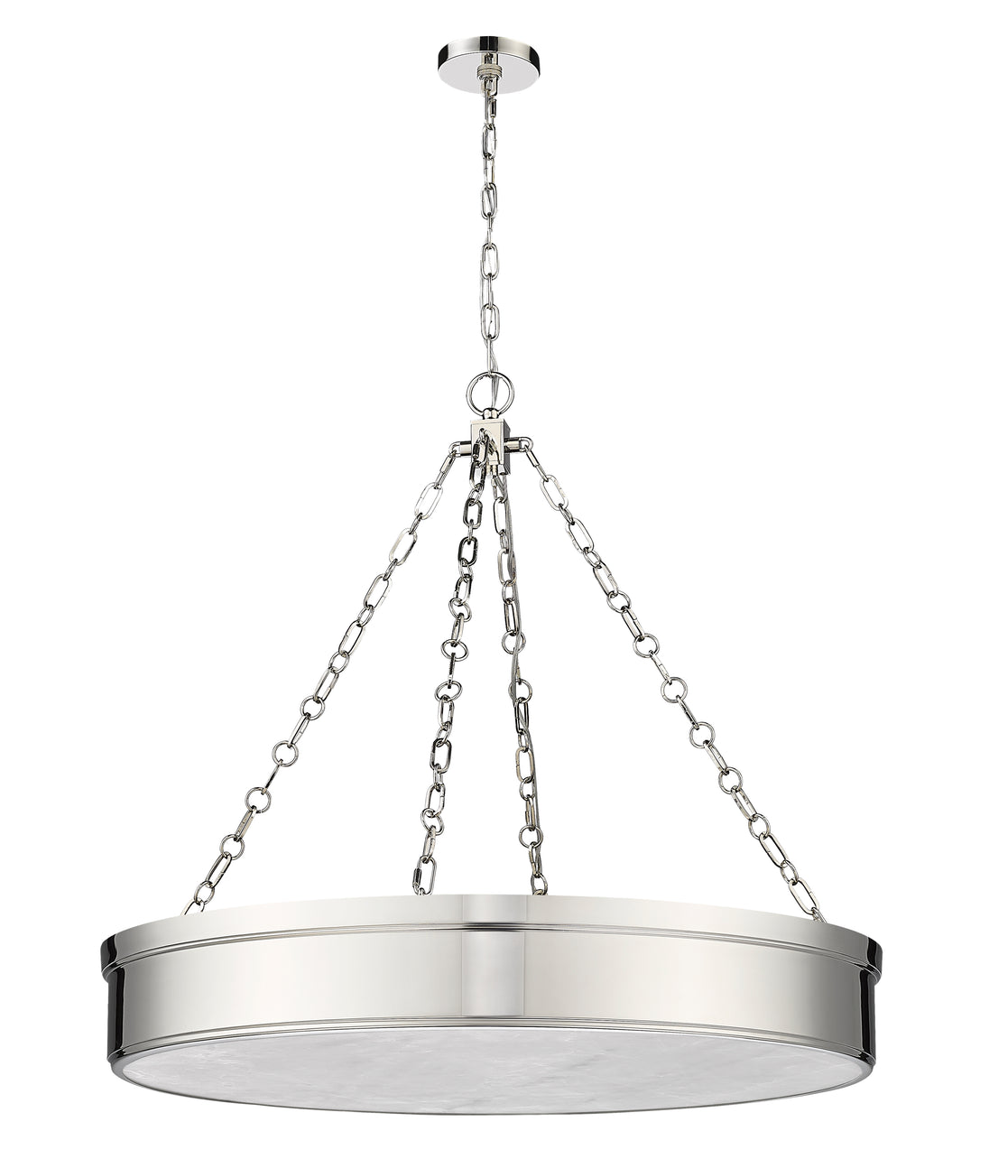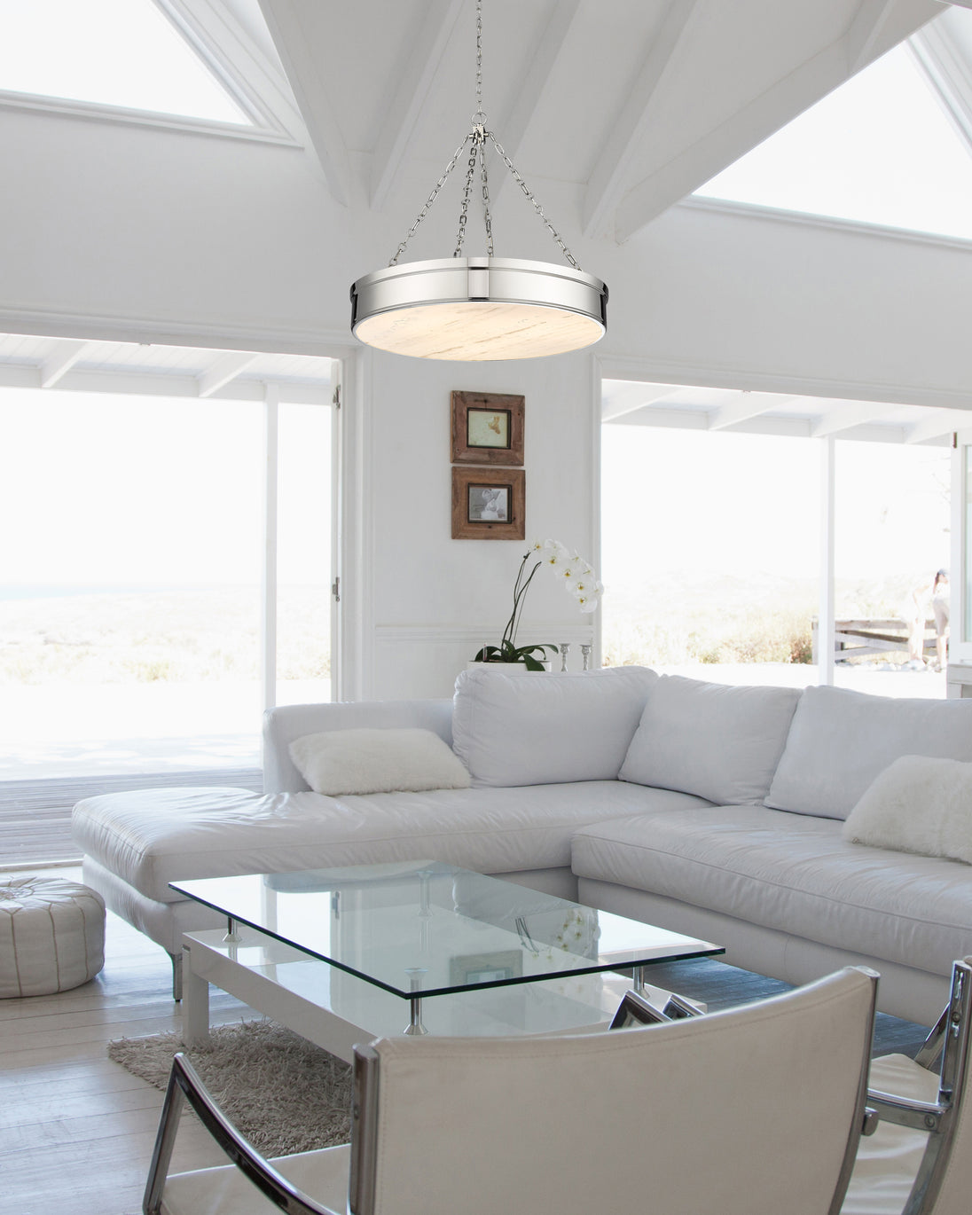 Classic simplicity takes on a circular silhouette in an LED pendant light that suits décor schemes from industrial to modern and adds a sleek minimalist look. From the Anders collection, this three-light LED pendant features a gleaming polished nickel finish steel circular frame suspended from cable chains reinforcing a symmetrical aesthetic. With a translucent alabaster diffuser, soft ambient lighting adds a warm glow to kitchens, living areas, and entryways.