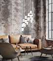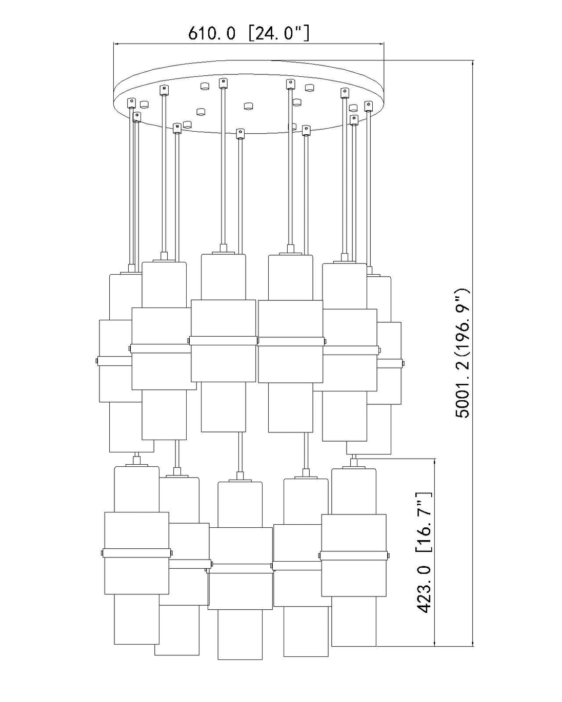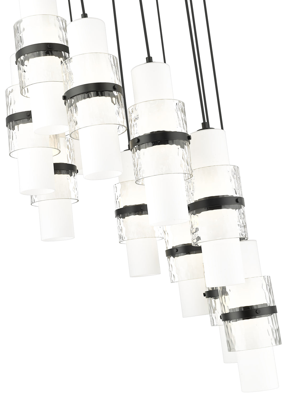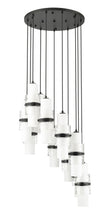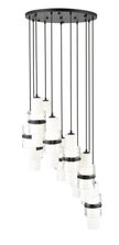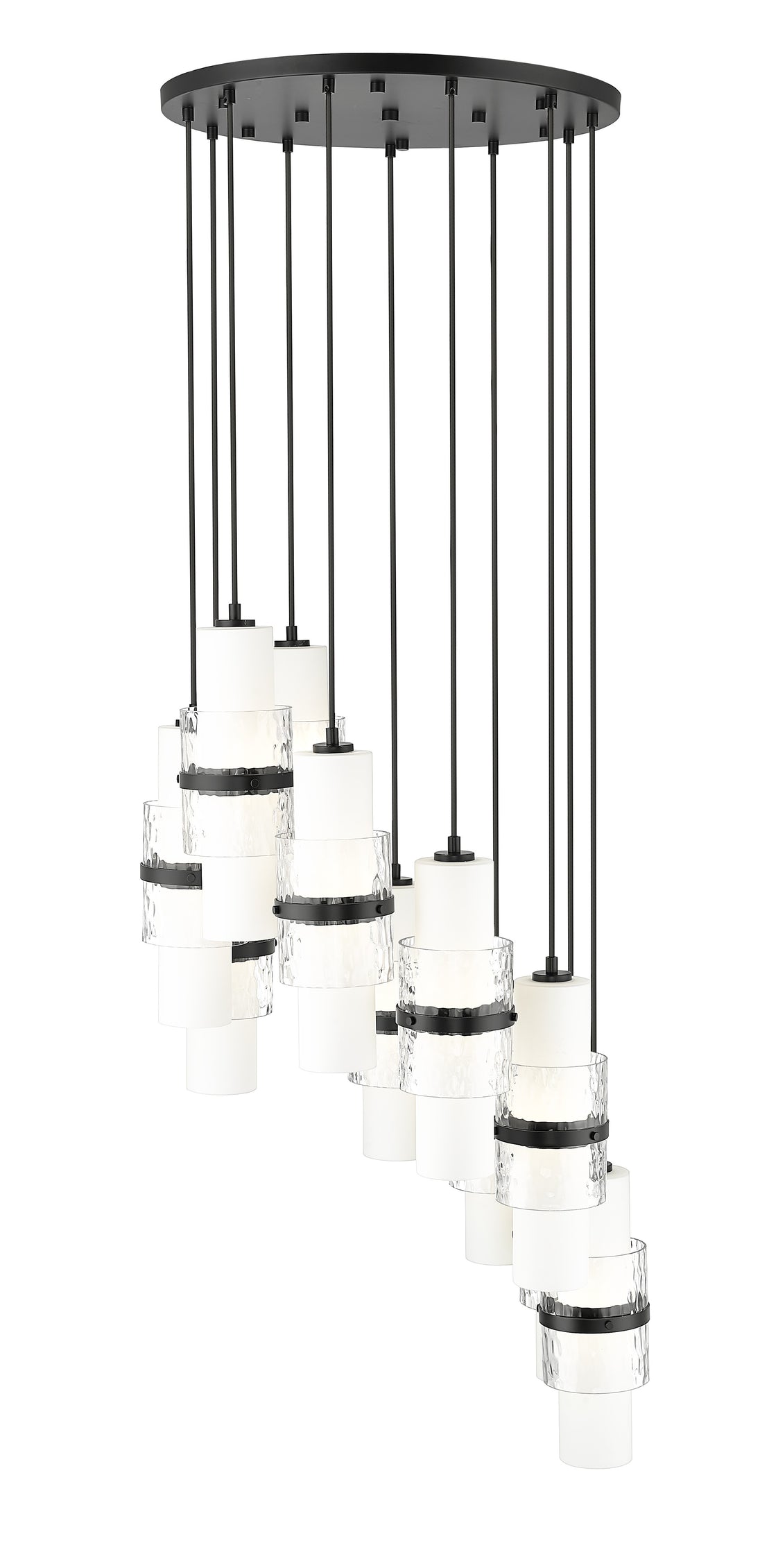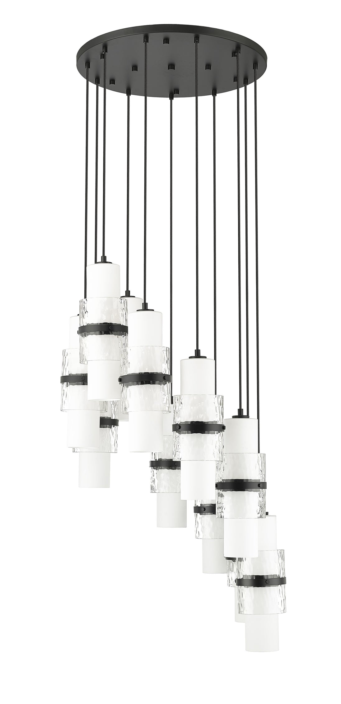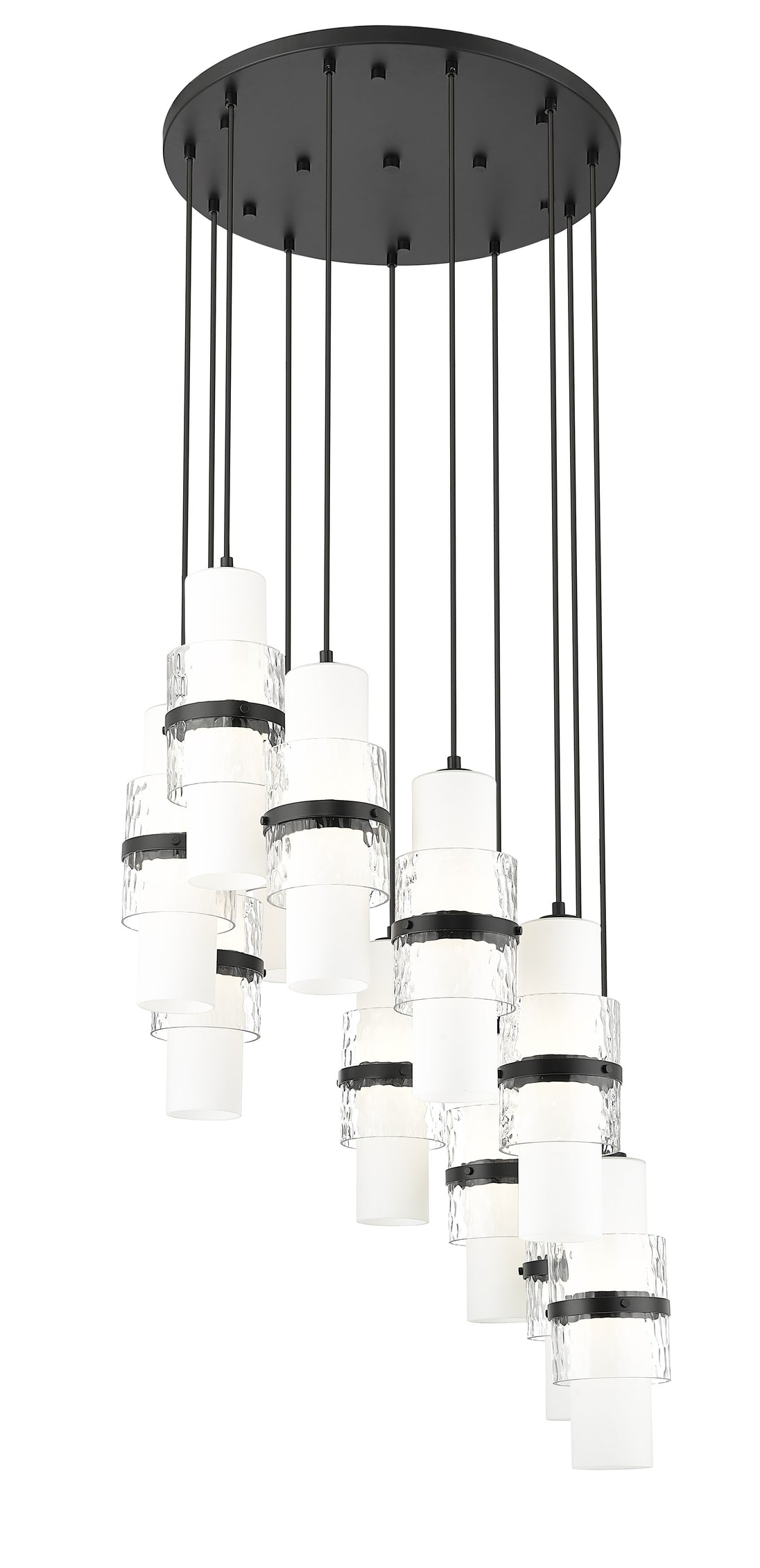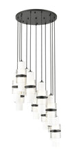 Stunning layers create rich dimension and depth for a modern 11-light chandelier. Surrounding each light, an etched opal glass cylinder is overlaid with clear textured glass and finished with a decorative matte black finish cuff, creating a bold look that complements over your dining table or living room.