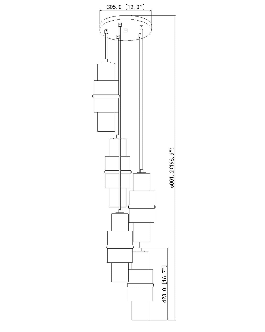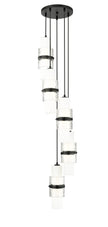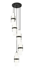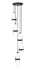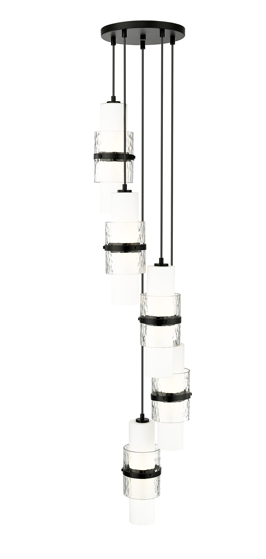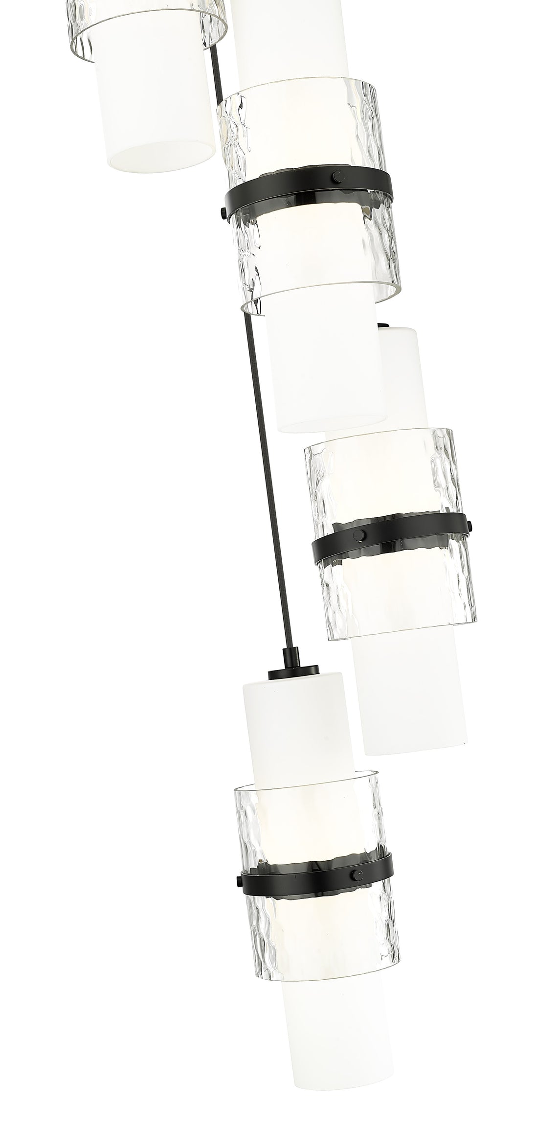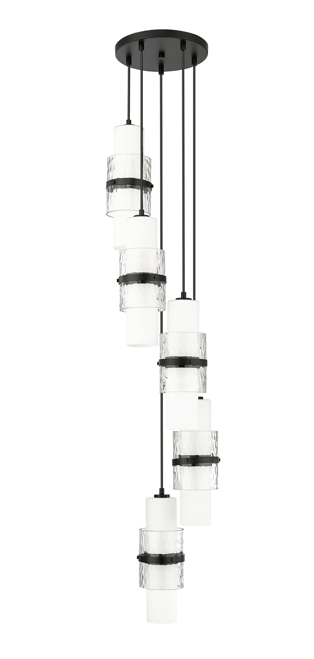 A chic spiral of cylindrical shades creates a compelling silhouette for this modern five-light chandelier. Perfect over a staircase or dining table, the chandelier features a matte black finish canopy and decorative cuffs, which complement etched opal and clear textured glass cylinders that combine to create a stunning display.