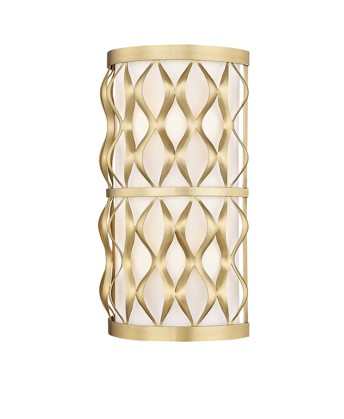 Romantic waves of metal cascade down the cylinder modern gold finish steel frame of this artisan-inspired two-light wall sconce, an excellent choice for lighting up hallways, living spaces, and bedrooms. Candelabra-style lights glow through a white fabric diffuser, a tantalizing contribution to its curvy ribbon accents. Timeless and seamless style add versatility and a theatrical flavor to this elegant wall sconce.