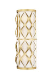 With an open-concept design marked by wavy vertical metal elements perfectly spaced on its modern gold finish steel frame, this three-light wall sconce reflects a gallery influence as it illuminates hallways, living areas, and bedrooms. Candelabra-style lights glow through a white fabric diffuser, a tantalizing contribution to its curvy ribbon detailing. Timeless and seamless style add versatility and a theatrical flavor to this elegant wall sconce.