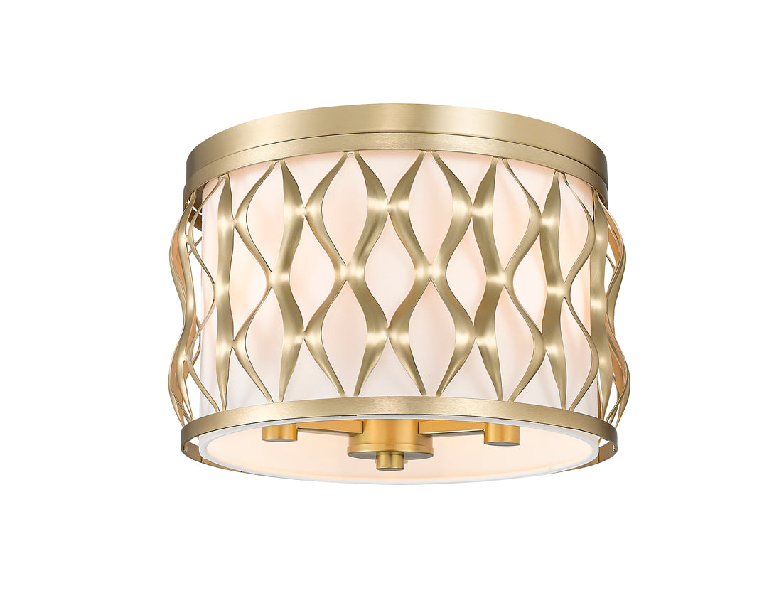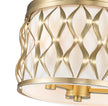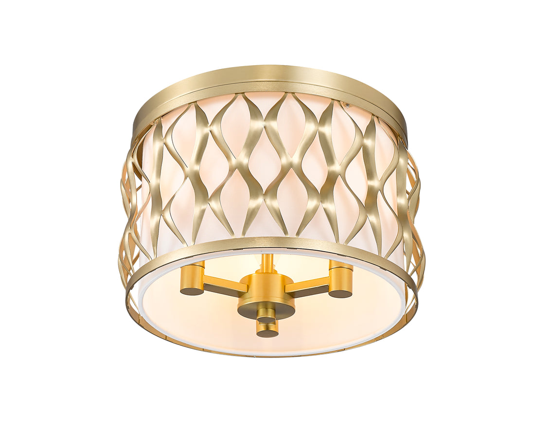 A drum silhouette is crisp and stylish as it enhances this three-light flush mount ceiling light with a timeless metal frame. Ride the vertical waves aligned perfectly around its modern gold finish steel frame, and bask in the soft glow of illumination filtered through a white fabric diffuser that eases harsh glare. This dimmable ceiling light offers artistry that becomes a focal point in a kitchen, foyer, or living room.