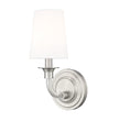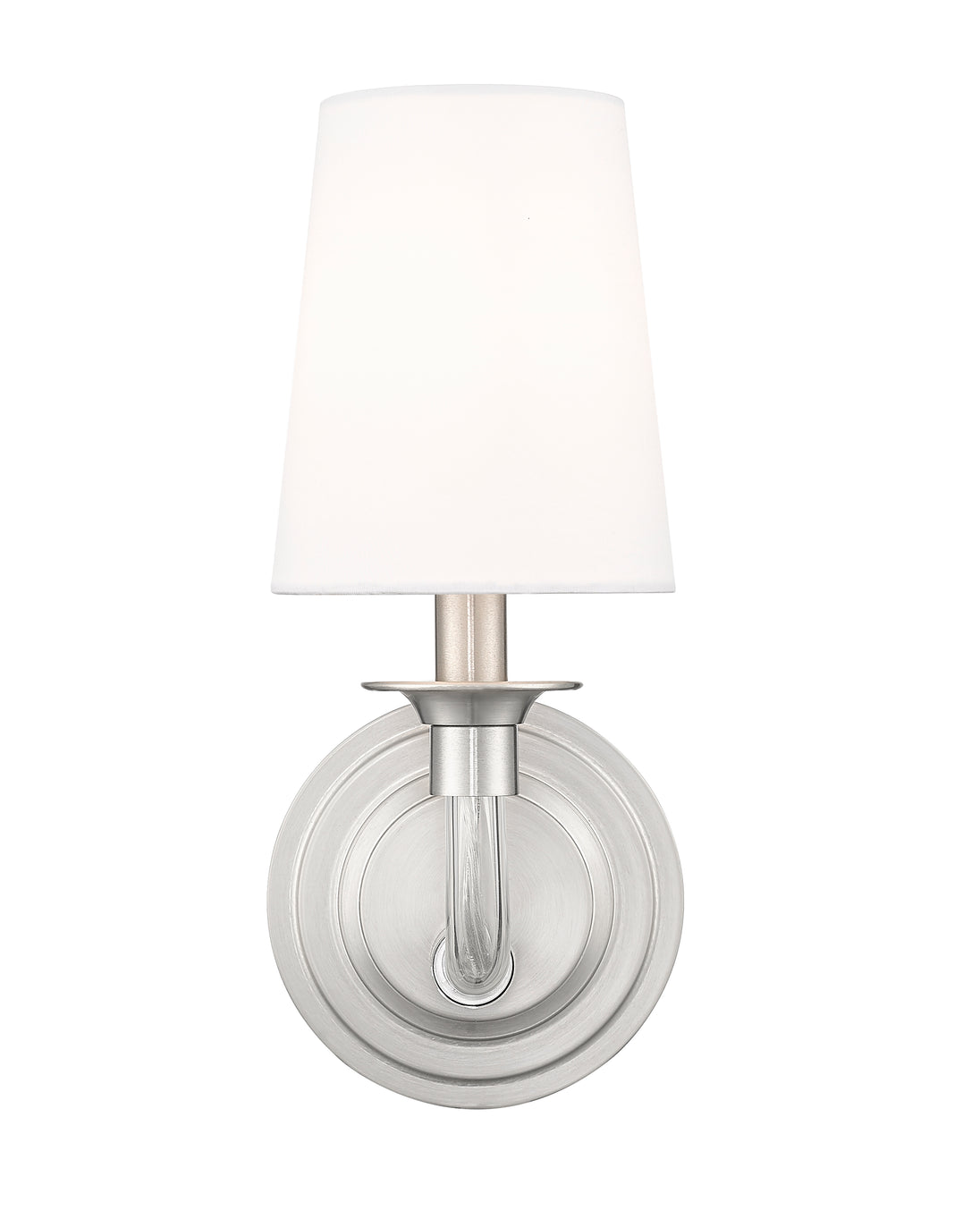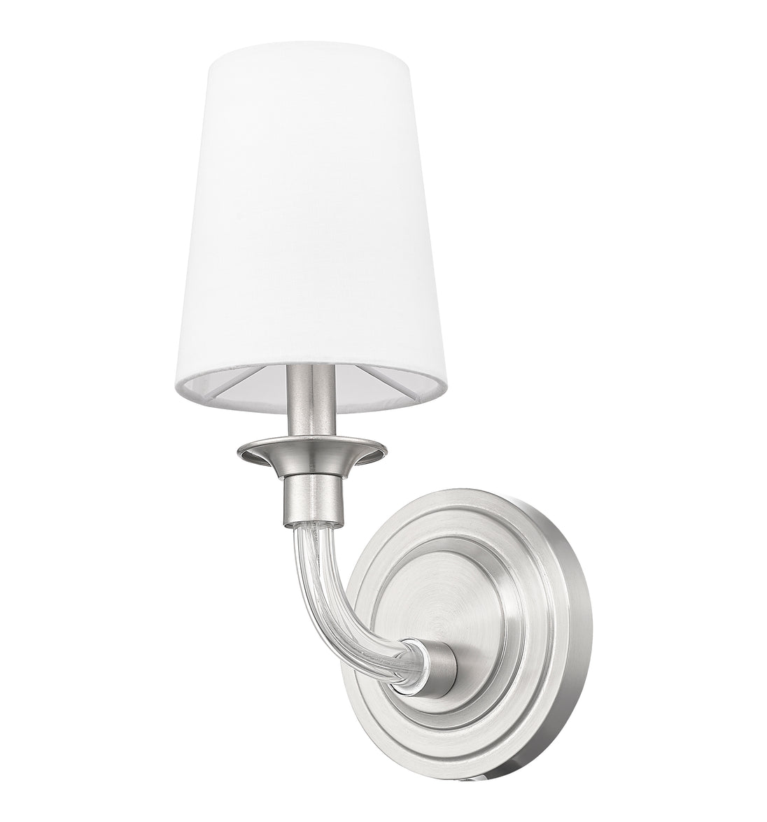 Classic beauty infuses a modern one-light wall sconce. It boasts a gently curved glass arm paired with a brushed nickel finish steel frame and wall plate. A gently tapering shade in white fabric softens its illumination and brings flexible style and sophistication.