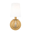 Cool glass and a rubbed brass finish create the perfect combination for this modern one-light wall sconce. Its round wall plate pairs with a slim glass arm, lending exceptional delicacy and classical ambiance. On top, a tapering shade in white fabric casts glowing, rich light, perfect for living areas and bedrooms, alike.