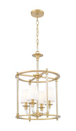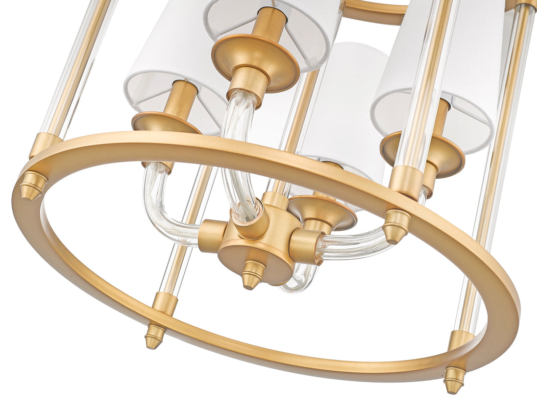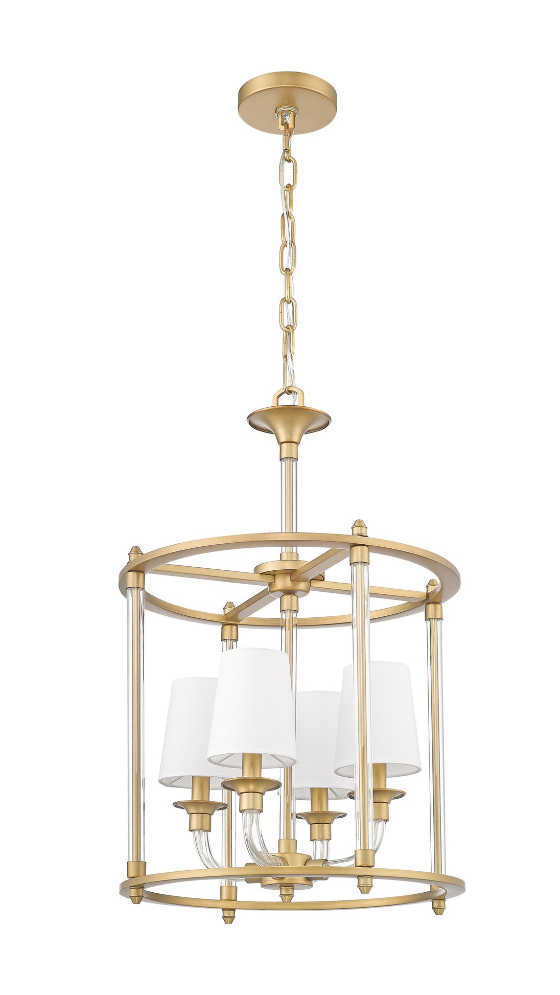 An open frame and tightly clustered lights create visual impact for this modern four-light chandelier. Beautiful over a breakfast nook or living room seating area, it features a rubbed brass finish and slim glass arms that impart sophisticated warmth and richness. The fixture is complete with four tapering shades in white fabric, casting softly diffused illumination over you space.