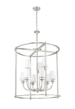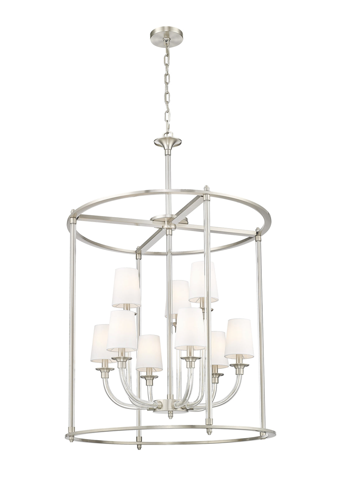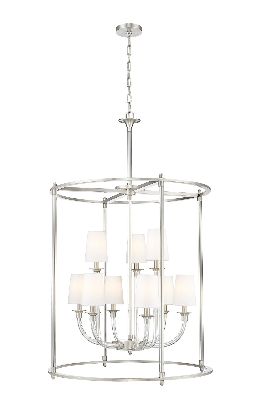 Marrying classical pre-war sophistication with updated finishes, this modern nine-light chandelier is a two-tiered design with an open cage framework. In brushed nickel, it gleams softly in the light and casts beautiful illumination with tapering white fabric shades.