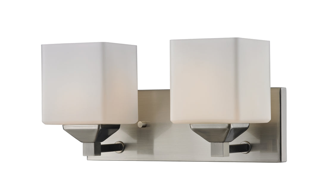 Rectangular shaped hardware and complimenting cube shades create a straight contemporary look. This two light vanity is finished in brushed nickel, and includes matte opal shades. This fixture will add a touch of contemporary to any décor.
