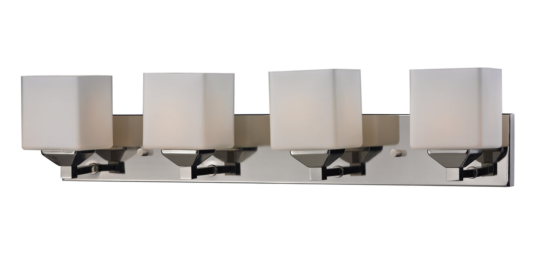 Rectangular shaped hardware and complimenting cube shades create a straight contemporary look. This four light vanity is finished in chrome, and includes matte opal shades. This fixture will add a touch of contemporary to any décor.
