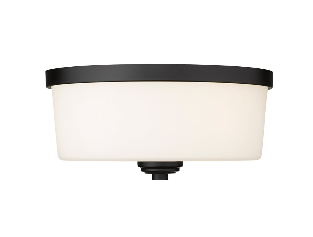 Bold and thick framing define this three bulb flush mount. Finished in Matte Black, the fixture also has complimentary a matte opal glass shade, which create a soft yet modern look.