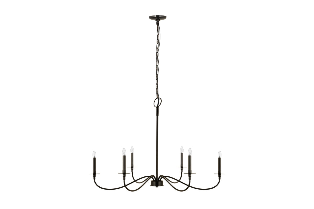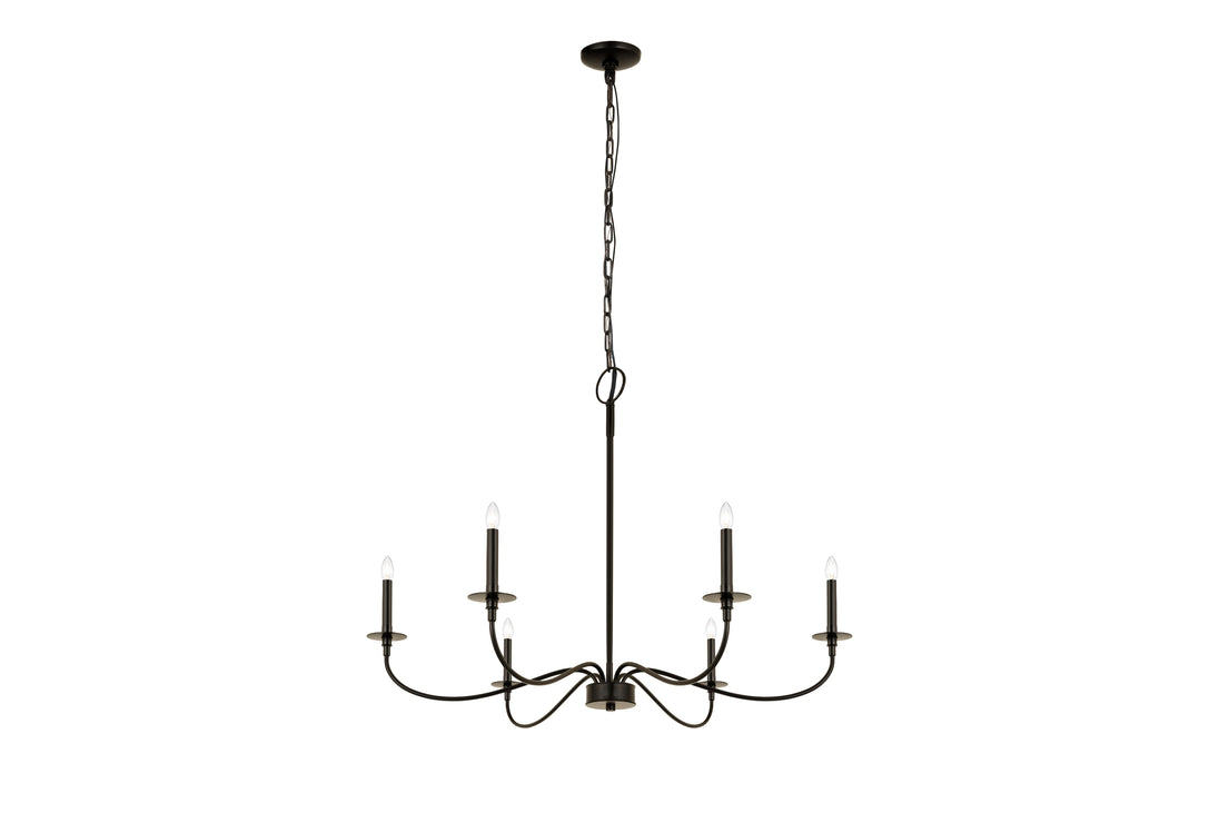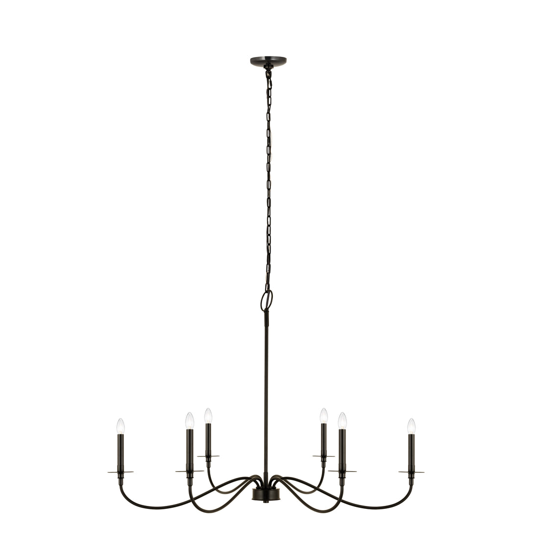 Bring romance to a modern or traditional kitchen, dining area, or main living space with this six-light chandelier from the Arrington collection. Crafted of bold matte black finish steel, its long, flared arms create a careful arrangement for placement of candelabra-style bulbs that borrow from a traditional motif.