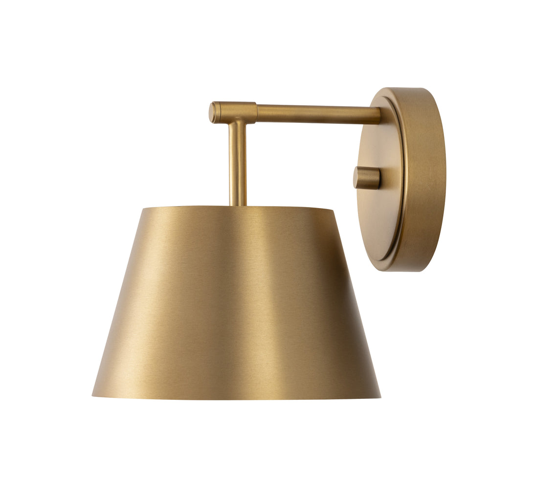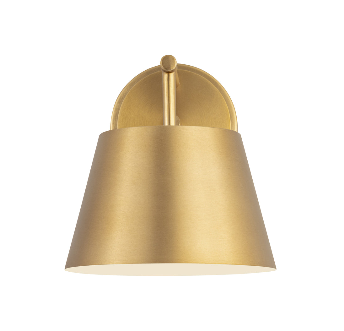 A modern empire shade is crafted in metal and showcases a white interior for bright direct illumination from this modern one-light wall sconce. The stylish look is eminently versatile, offering a rich modern gold finish in living rooms, halls, bedrooms and beyond.