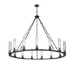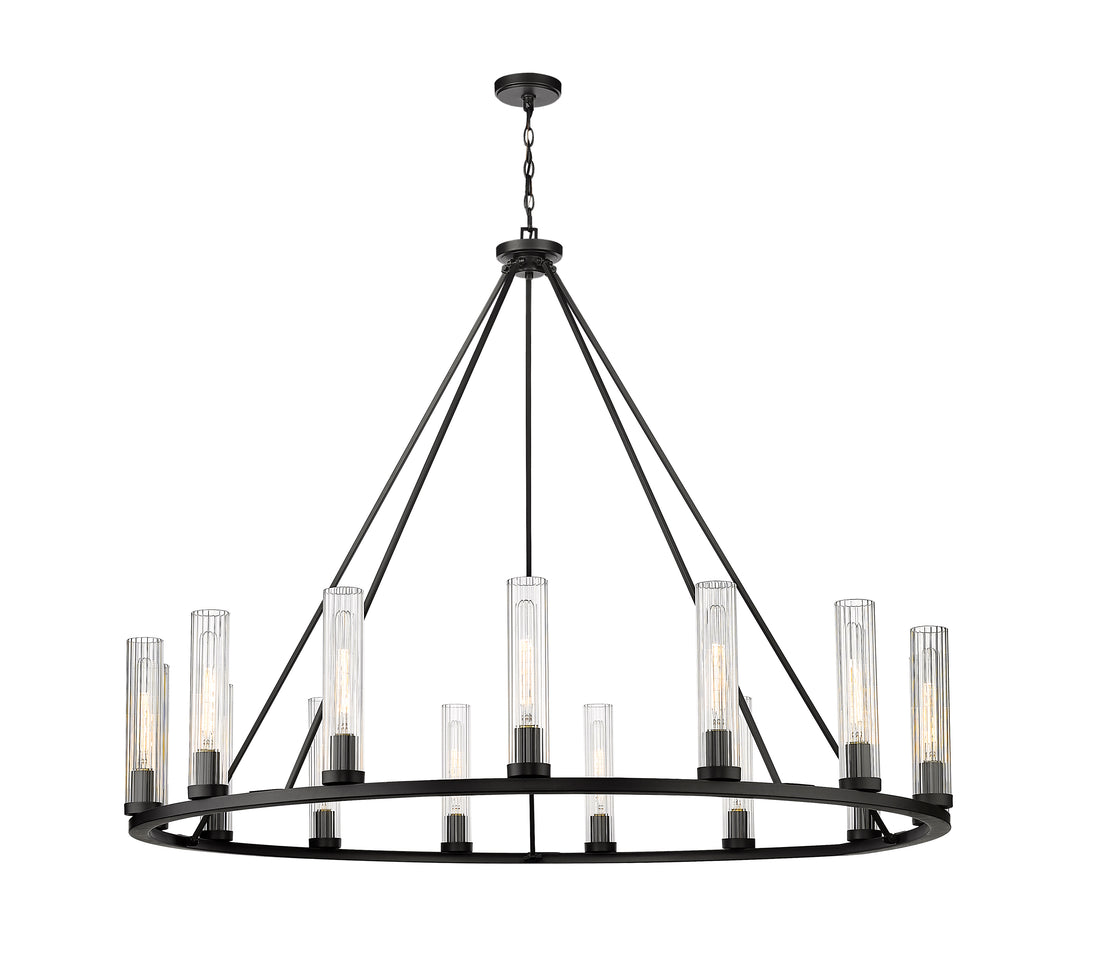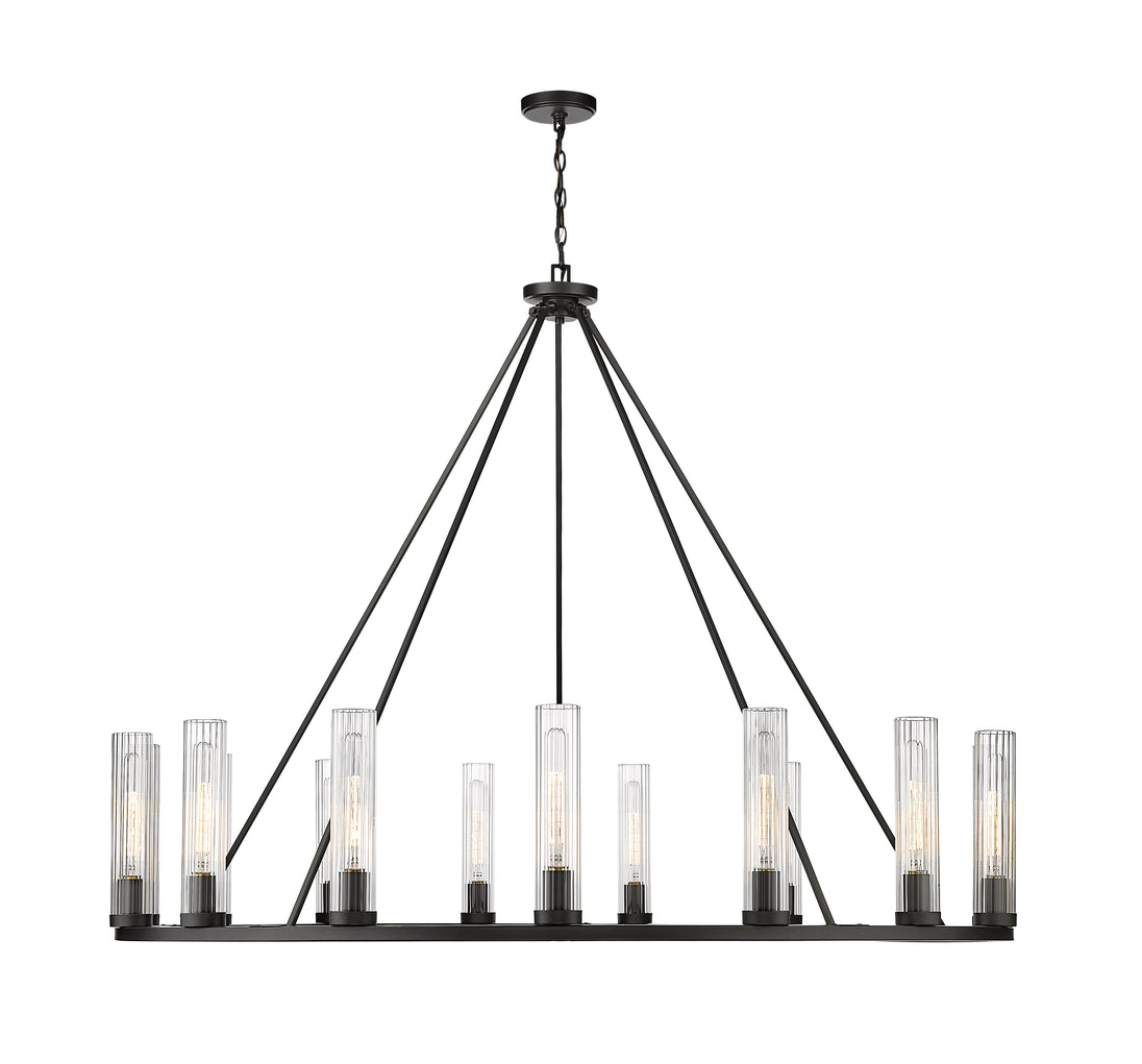 Indulgent castle-inspired vibes bring a delightfully bold look in the Beau fifteen-light chandelier, a captivating choice for highlighting kitchen islands and dining spaces. Transitional in motif, this circular fixture suggests industrial aesthetics with a cool bronze finish steel frame dotted with slender tube shades fashioned of fluted glass.