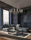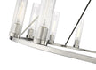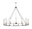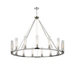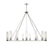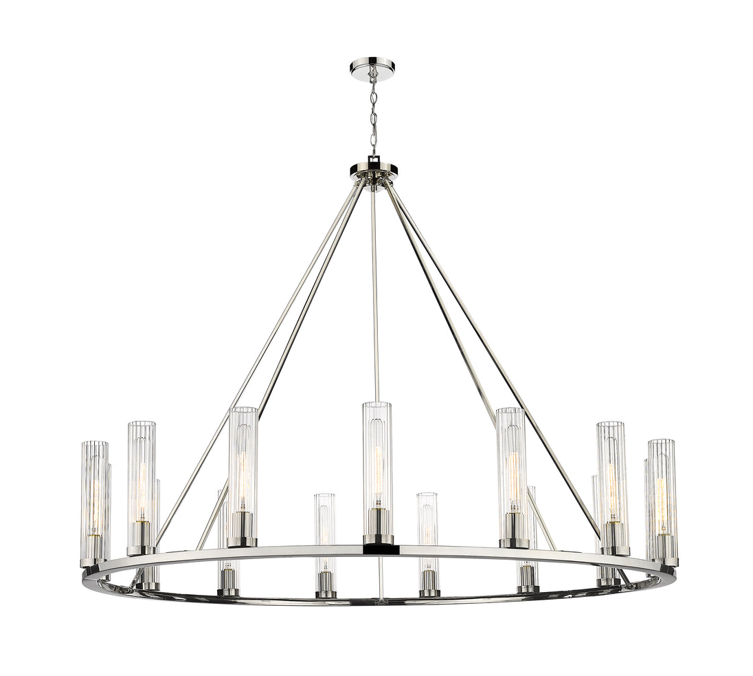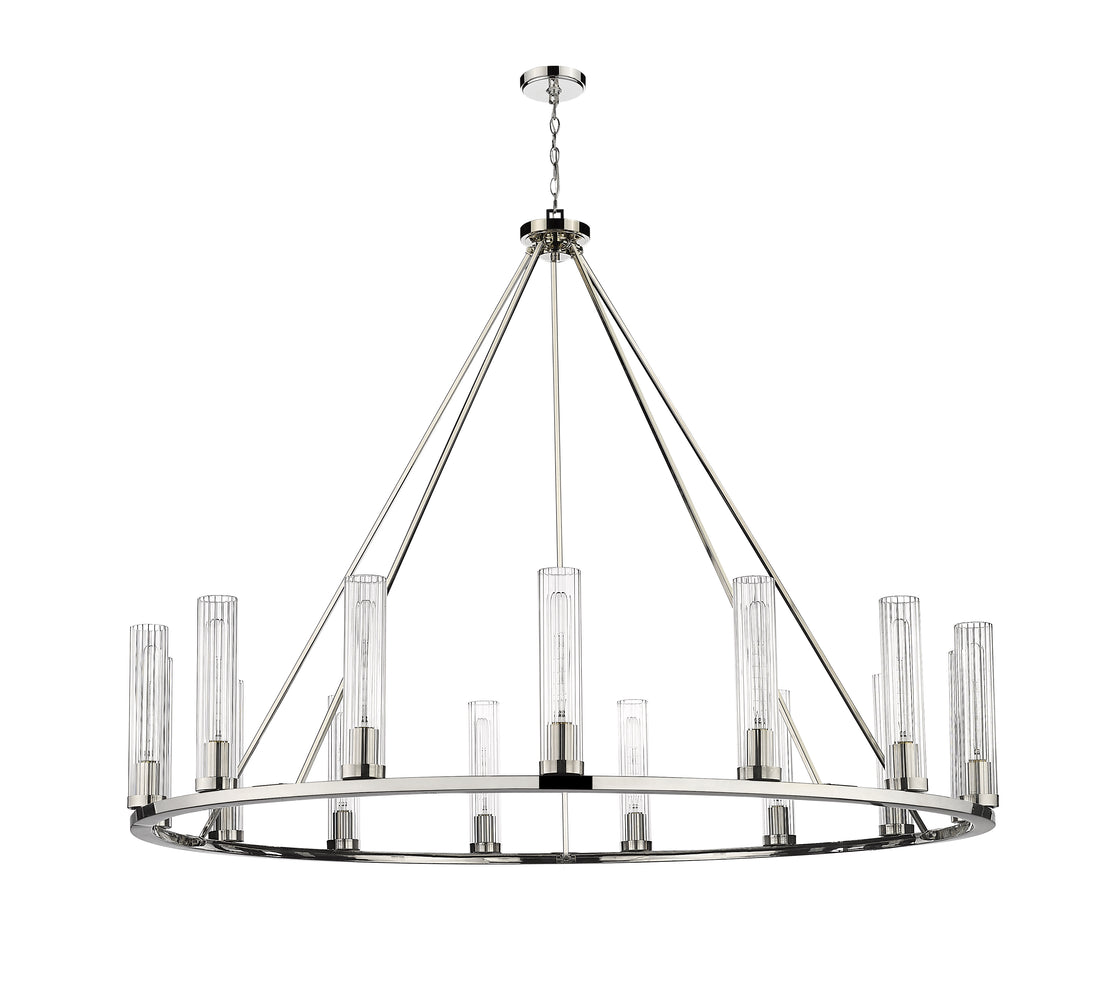The Beau fifteen-light chandelier creates a stunning silhouette and chic look dressed up with charming attitude. Perfect for kitchen islands, entryways, and dining spaces, this transitional circular fixture suggests industrial aesthetics with a gleaming polished nickel finish steel frame dotted with slender tube shades fashioned of fluted glass.