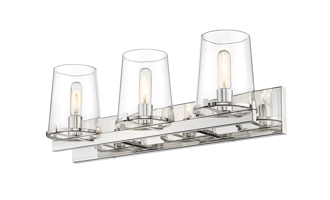 Outfit a transitional bath space with the Callista three-light vanity light and watch the magic transformation evolve. This fixture offers a linear design with a hand-crafted rectangular frame and wall mount crafted of gleaming polished nickel finish steel. Wrapped up with a trio of delicate tapered clear glass shades, the Callista vanity light embellishes a custom vanity with exceptional sophistication.