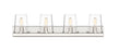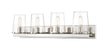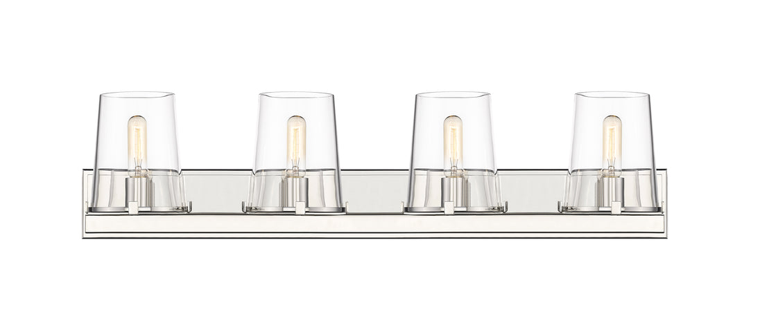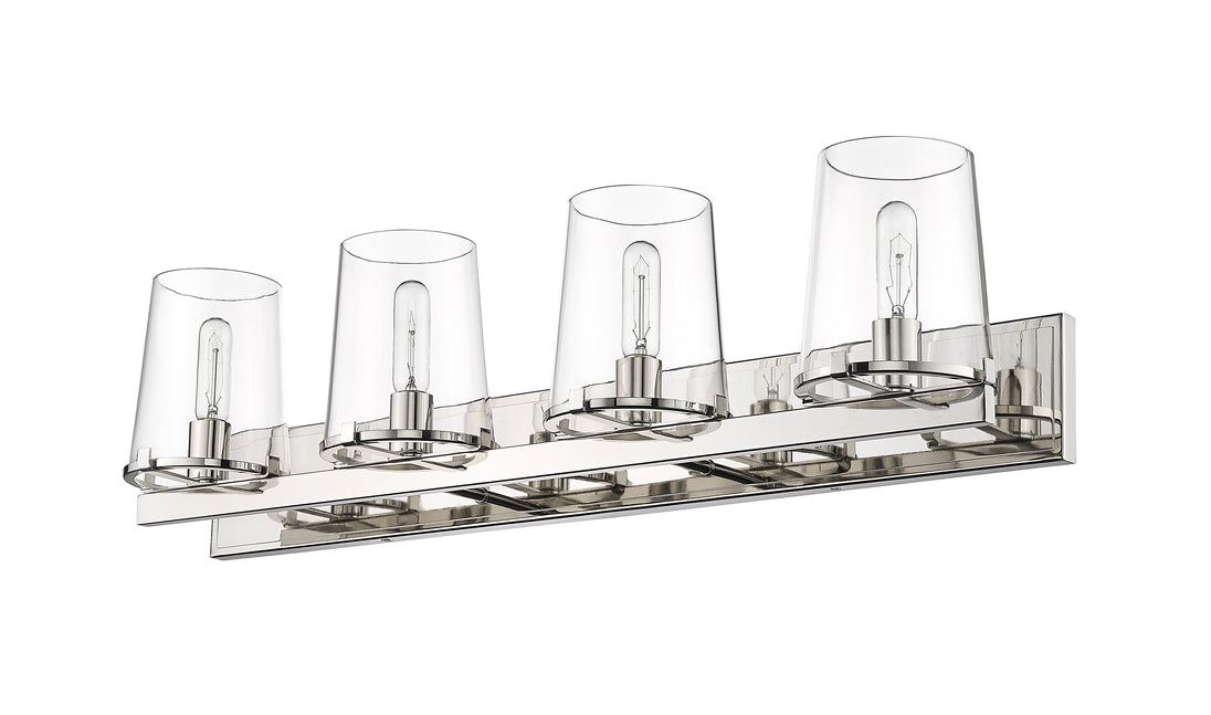 Gleaming polished nickel steel radiates with upscale attitude, turning the Callista four-light vanity light into a superb option for ambient lighting in a transitional or modern bath space. Introduce a motif blended of village fare and nautical inspiration to add a tasteful lift with extra elegance. Clean styling features a handcrafted rectangular polished nickel finish steel frame and wall mount and four tapered clear glass shades, delivering a glam ambiance that works in a number of settings.