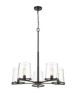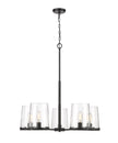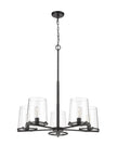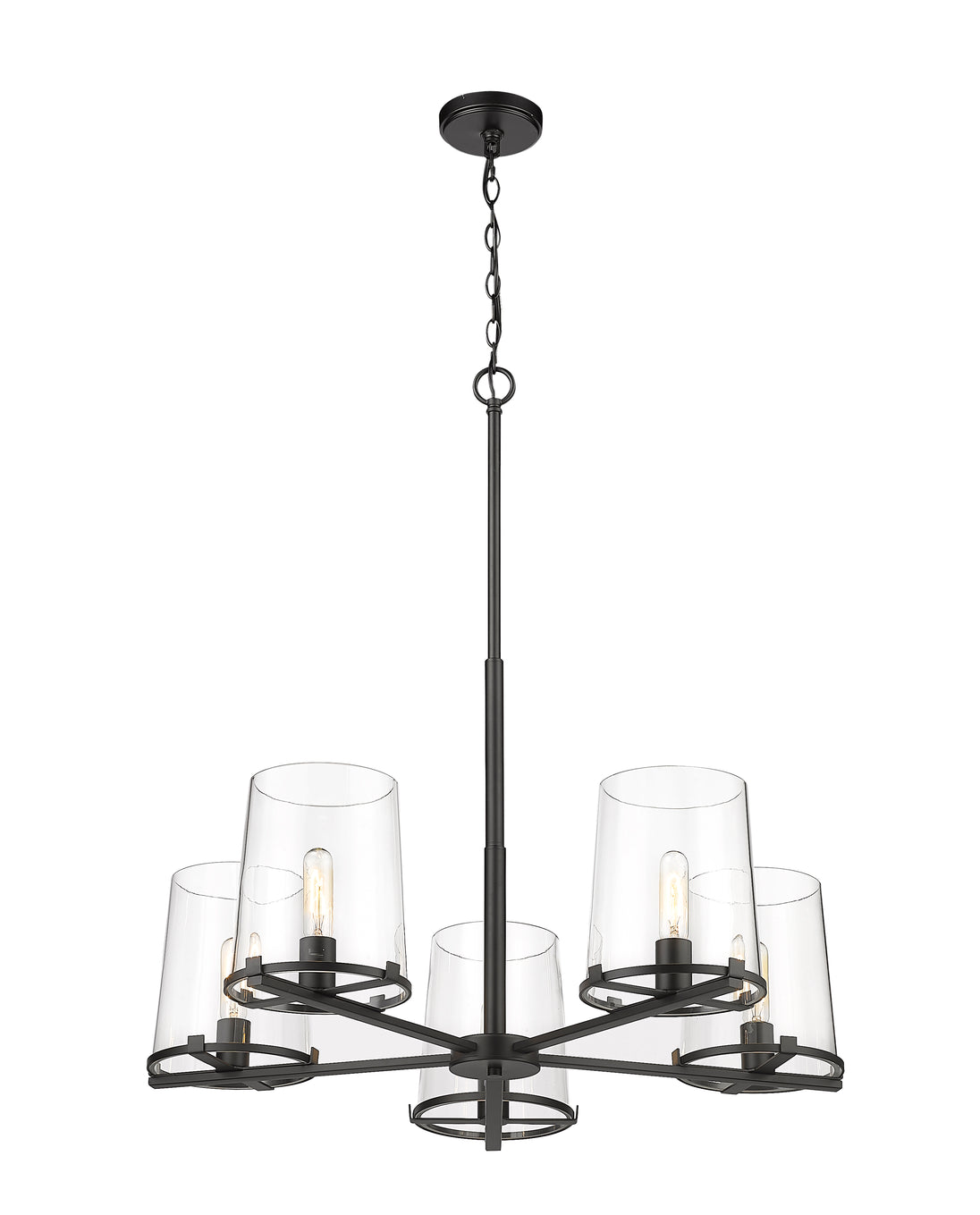 The Callista five-light chandelier offers a theatrical nod to hybrid nautical and village fare, becoming a focal point in a transitional dining room, living area, or bedroom. Decadence on display blends a hand-crafted matte black finish frame with ring holders that nestle sparkling tapered clear glass shades. Industrial-inspired accents add versatility to this captivating fixture.
