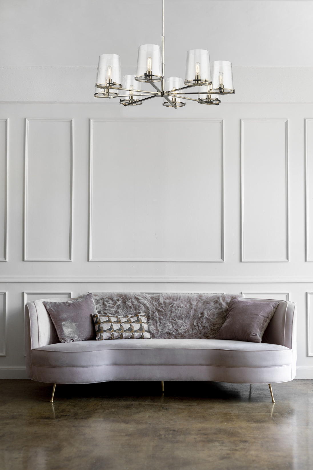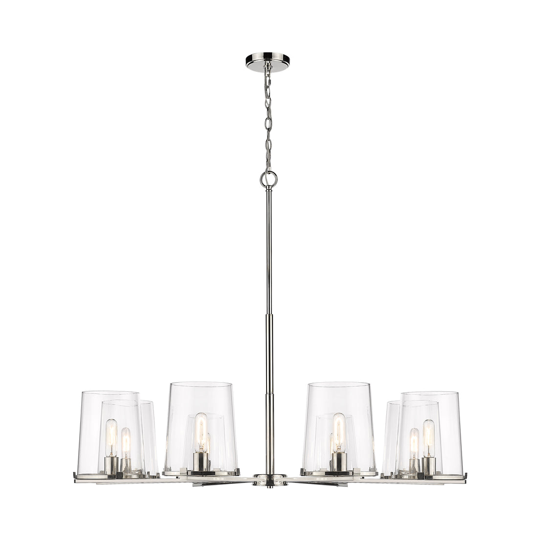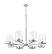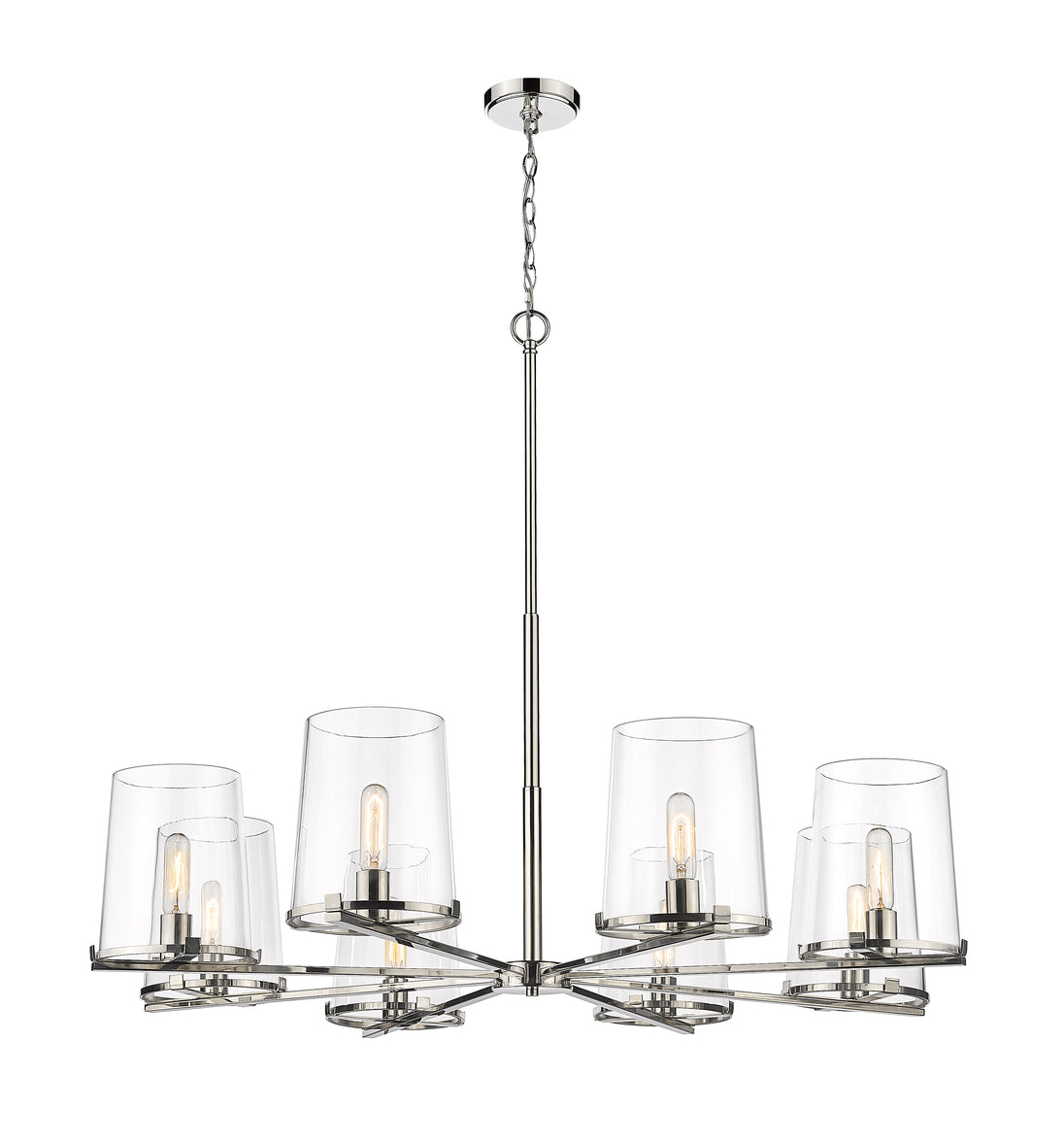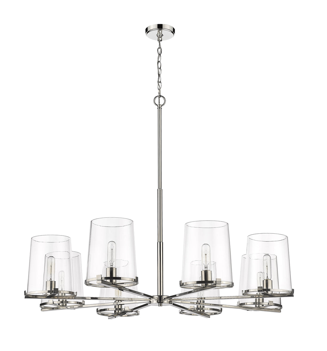 Setting the pace for a chic, glam-influenced living space, the Callista eight-light chandelier delivers with a mix of nautical and village-inspired charm. This exceptional fixture creates a pleasing round silhouette formed with a handcrafted polished nickel finish steel frame and its wagon wheel silhouette. Tapered, clear glass shades filter ambient lighting and wrap up a list of high-energy yet easy-living features designed to impress.