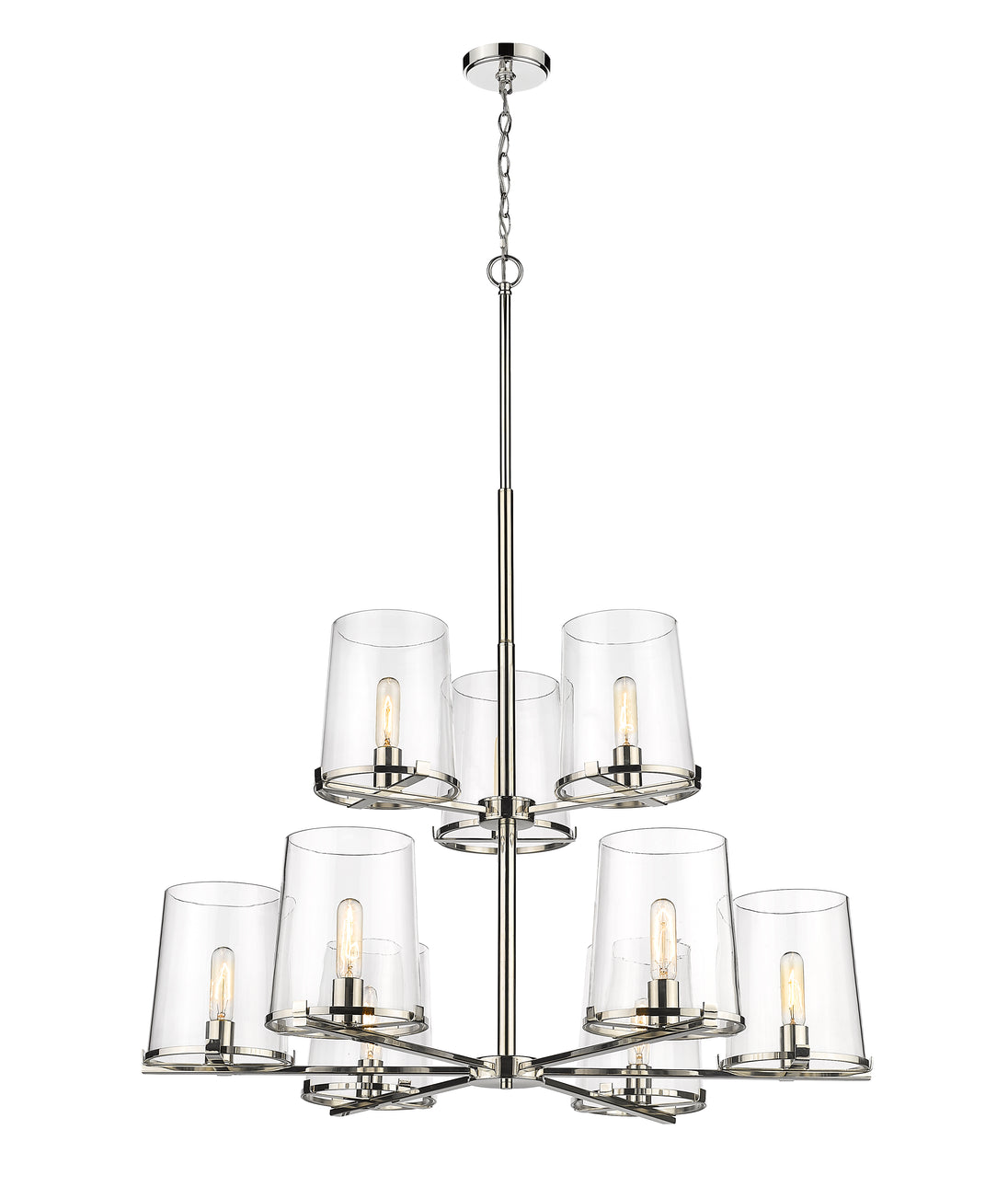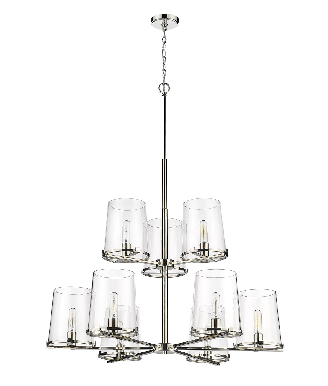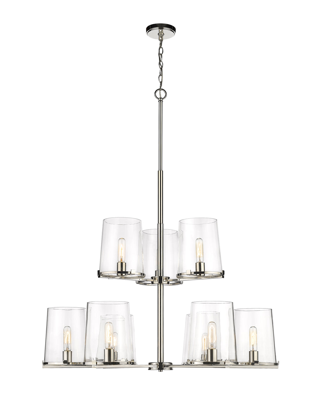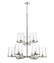 Whether modern or transitional, a custom living space deserves the tasteful design of the Callista nine-light chandelier. Fashioned with a hand-crafted polished nickel finish steel dual-layer frame and circular shade rings, it furthers sophisticated style with nine tapered clear glass shades. Make this fixture a focal point in a kitchen, dining, or main living space.