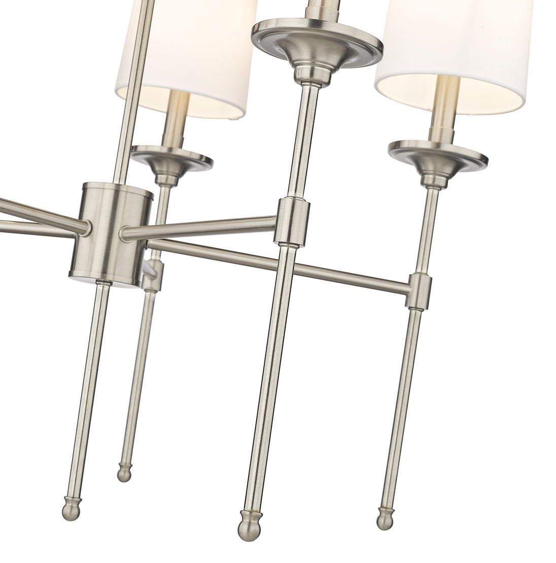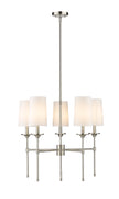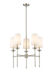 Emulating the most sophisticated design motifs, the Emily five-light chandelier adds a tasteful dose of decadence tempered by softness. This fixture features a carefully aligned collection of five lamp-like lights with off-white shades that encircle a frame fashioned of brushed nickel finish metal. A neutral palette creates welcomed versatility to blend with variable ensembles, and a classic aesthetic fit for an upscale living space.