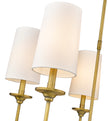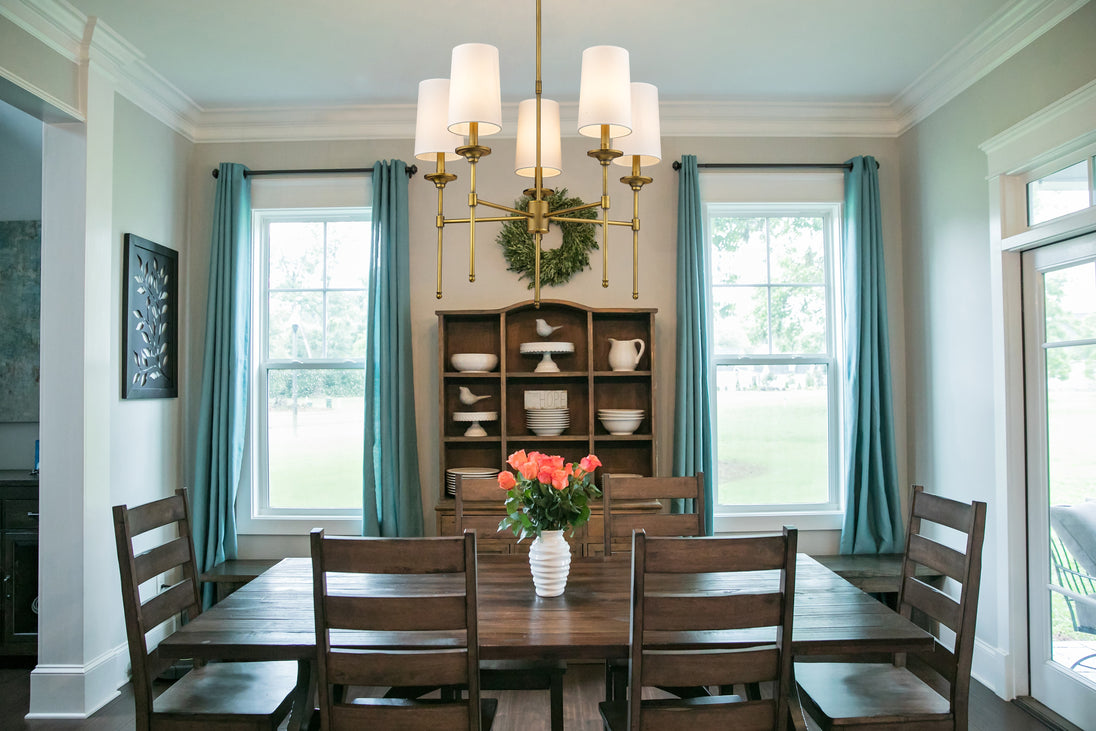 Transform a traditional dining room with the Emily chandelier. Sleek and elegant, this metal chandelier features five off-white cloth shades affixed to a slim, steel frame. Complete with a rich, rubbed brass finish, this fixture beautifully illuminates a room with soft, diffused light.