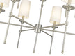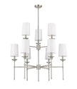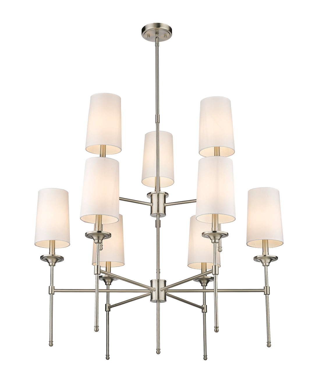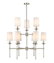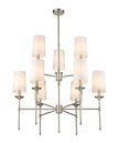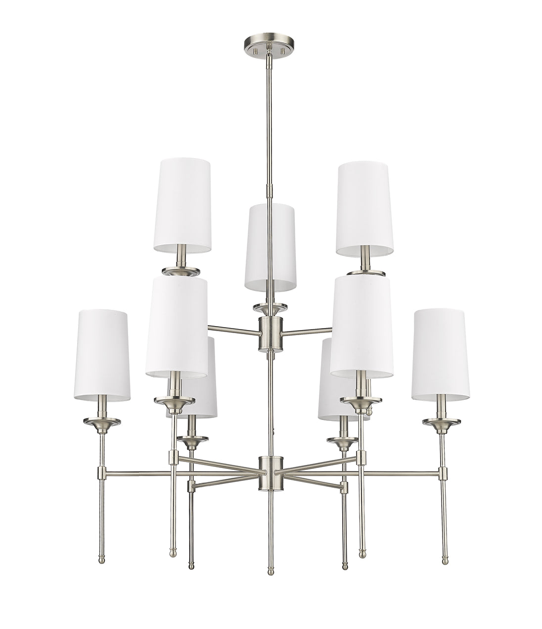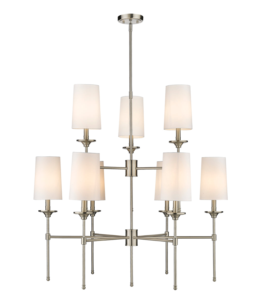 Embrace the eye-catching layered design of the Emily nine-light chandelier, a custom look with traditional charm and a transitional motif suitable for upscale settings. Capture attention with a fixture featuring stemmed lamp-like elements topped with off-white fabric shades, and mounted to an intricate frame made of brushed nickel finish steel. A tapered silhouette turns this chandelier into a compelling choice for highlighting dining spaces, entryways, and main living areas.