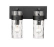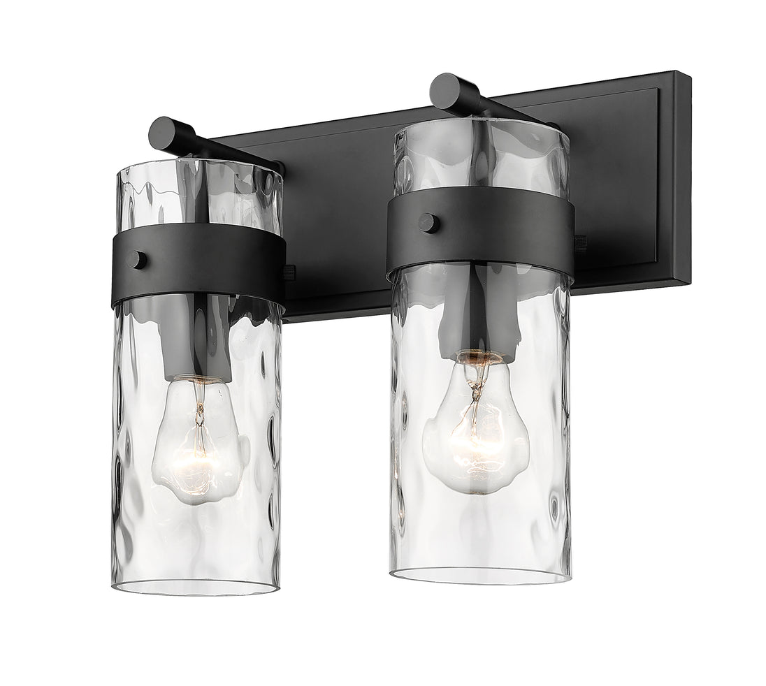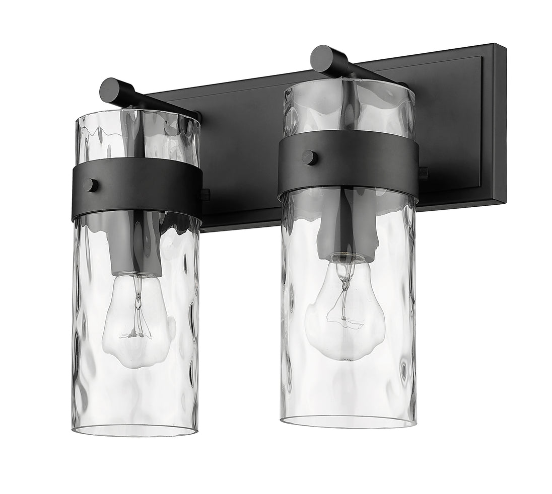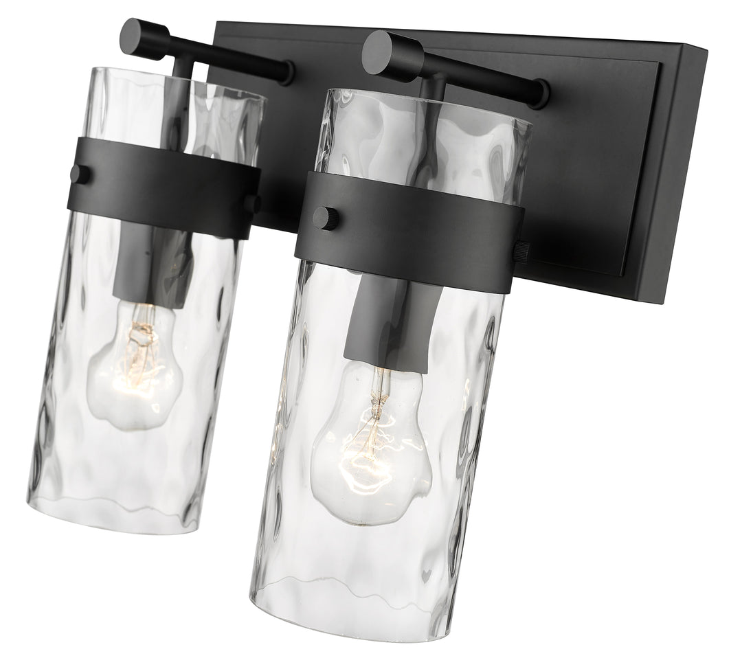 A clean, classic feel that blends with any decor, this two-light vanity fixture flaunts a brushed matte black finish and steel construction. The glass cylinder shade is enhanced with a ripple texture and ensures the perfect ambiance in hallways or bathrooms.