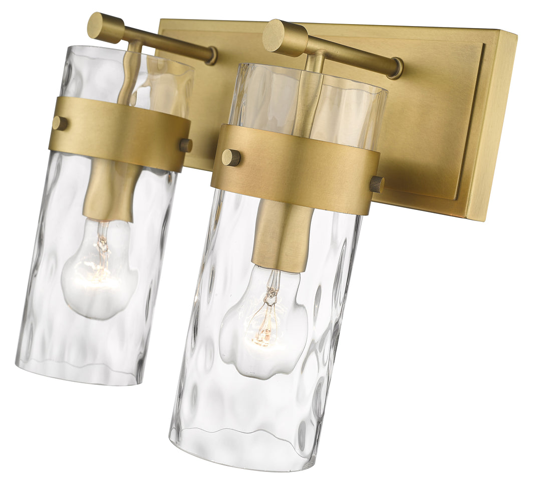 A clean, classic feel that blends with any decor, this two-light vanity fixture flaunts a rubbed brass finish and steel construction. The glass cylinder shade is enhanced with a ripple texture and ensures the perfect ambiance in hallways or bathrooms.