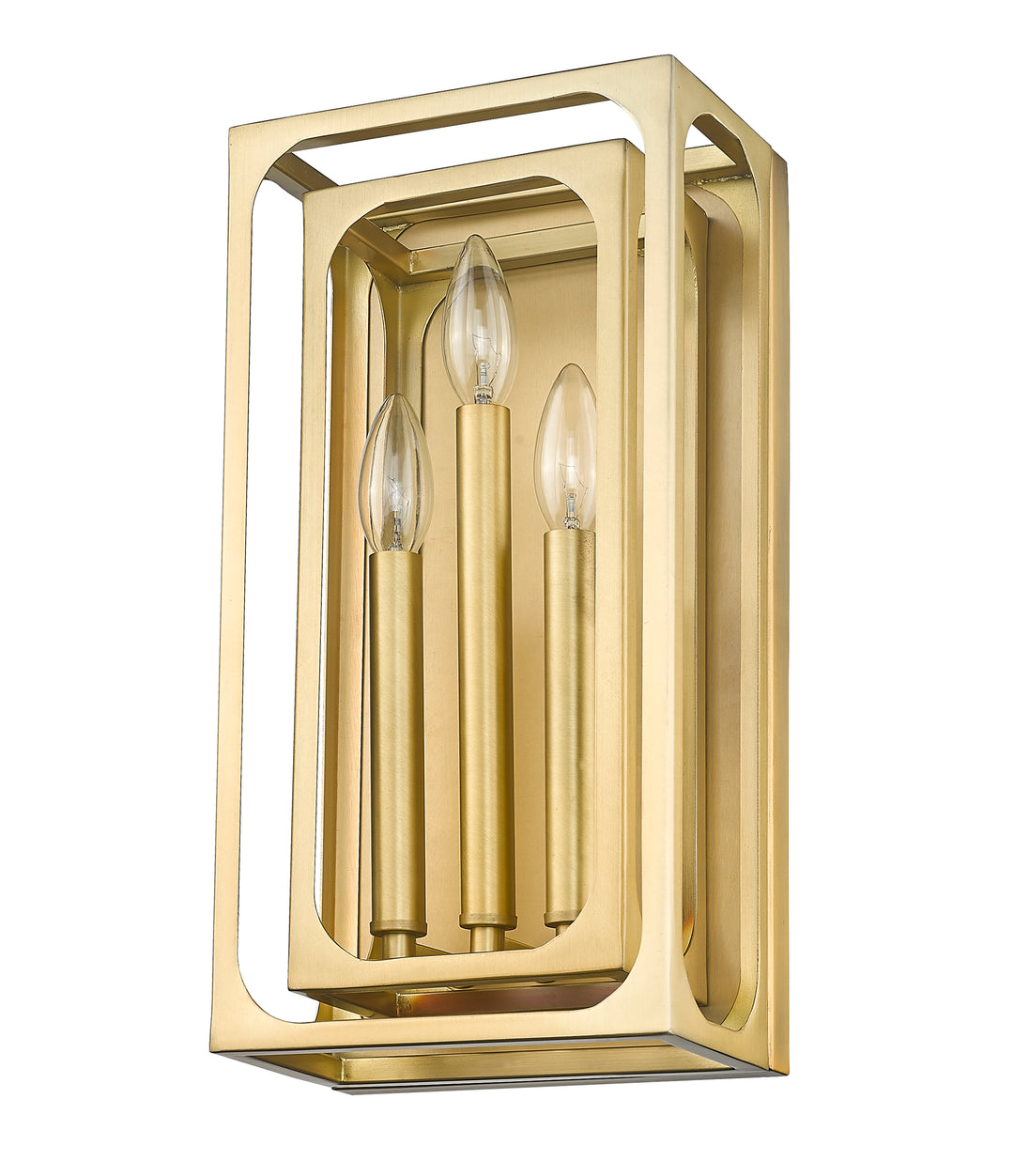 Choose the ultra-glam ambiance of a gleaming fixture perfect for making a tasteful impact in modern and transitional spaces. The Easton metal three-light wall sconce creates a mixed industrial and farmhouse look with candelabra bulb mounts set in a graduated arrangement, centered in full view thanks to a dual-layered openwork rubbed brass finish metal frame. A bold version of minimalism softens with a warm finish, accomplishing its objective with extraordinary minimalist construction.