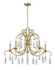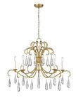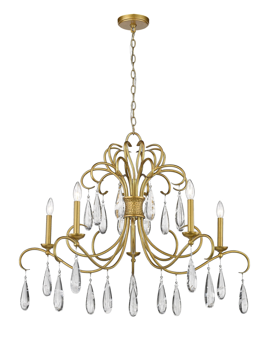 Sinuous scrolls and delicate crystal teardrops lend lush sophistication to a contemporary five-light chandelier. In gilded gold, it creates a rich, organic design element over an entry or in a dining room. Candelabra lights are a classic touch, offering a soft, warm glow for inviting ambiance.