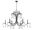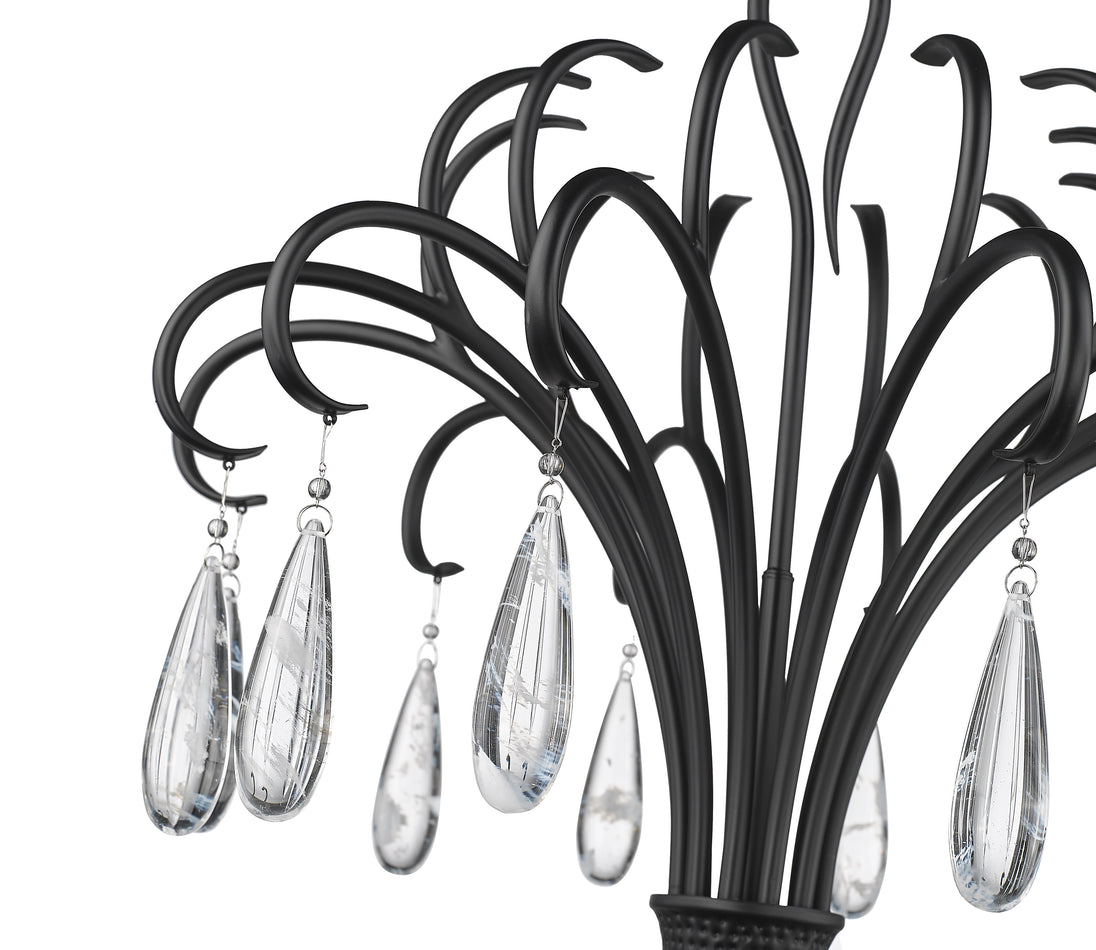 Ornate scrolls create a sinuous, delicate silhouette for a contemporary six-light chandelier from the Amara collection. Gorgeously adorned with teardrop crystals that sparkle in the light, it creates a stunning focal point over a foyer or dining table. A matte black finish adds depth to classic candelabra lights for a rich, inviting ambiance in any room.