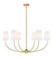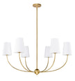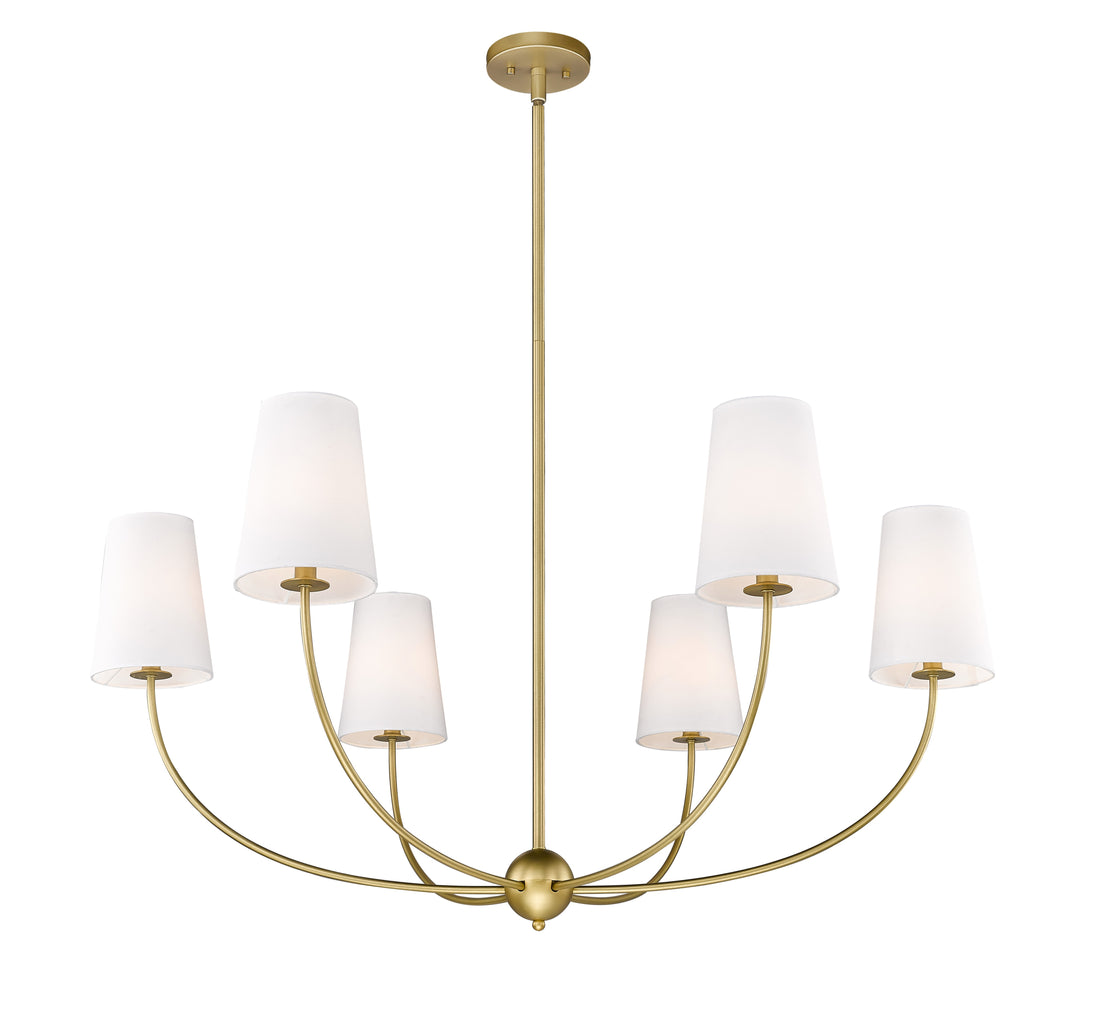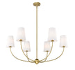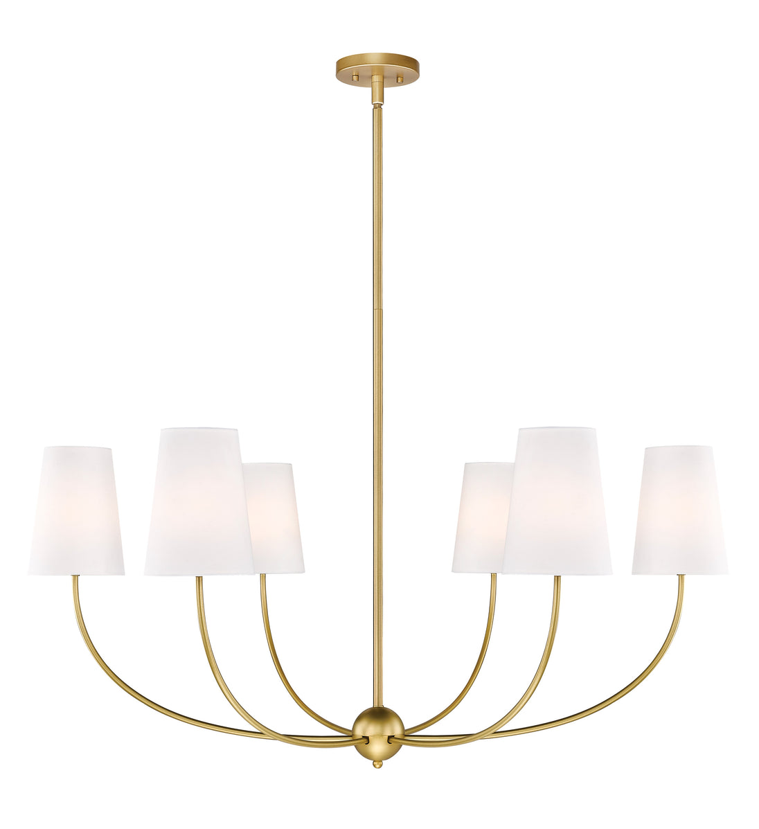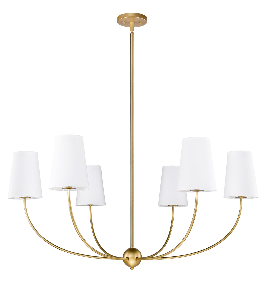 The Shannon six-light chandelier becomes a focal point in any modern space with its easy yet sophisticated aesthetic. Embrace the beauty of a rubbed brass finish steel frame with subtly curved arms and lights capped with classic white fabric shades reflecting traditional style. Infuse ambient lighting over a dining ensemble, in an entryway, or in a main living area with this tasteful chandelier.