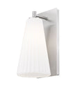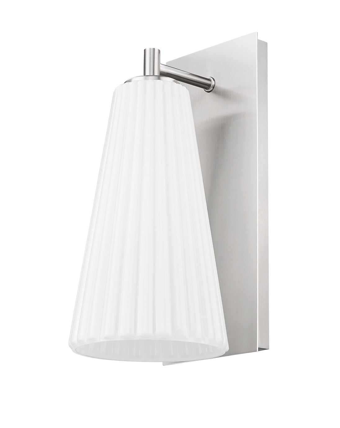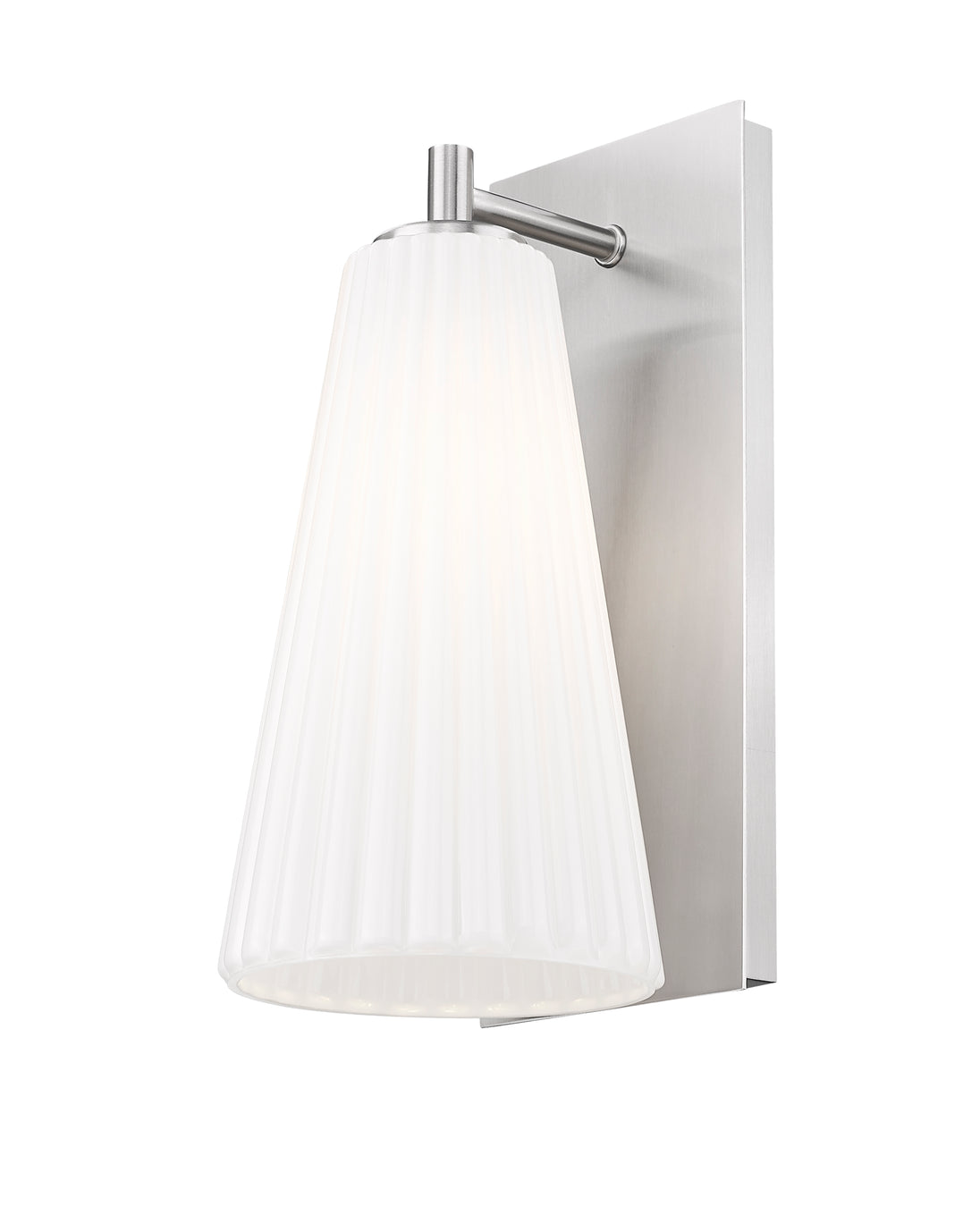 Showcasing radiant luminosity and a sleek silhouette, this modern one-light wall sconce is a standout choice for your living space. Its shade is crafted from delicate fluted white glass that creates a cool, sophisticated vibe. A rectangular backplate and arm feature a fresh brushed nickel finish that's sure to complement a surrounding decor.