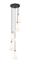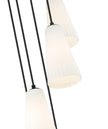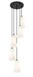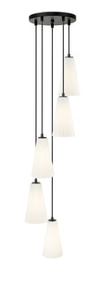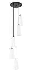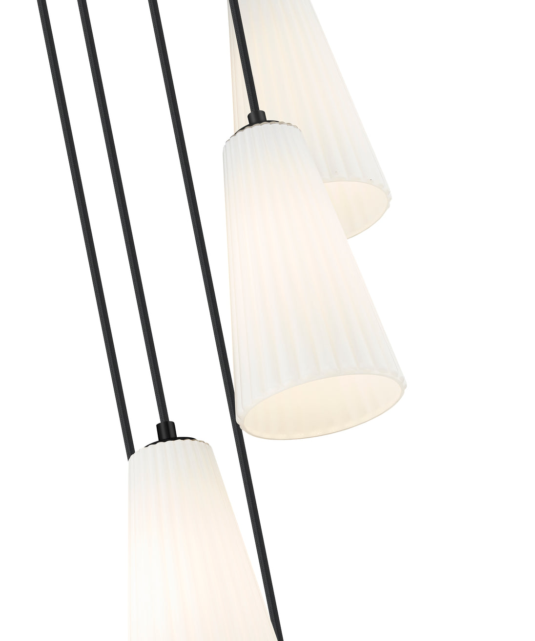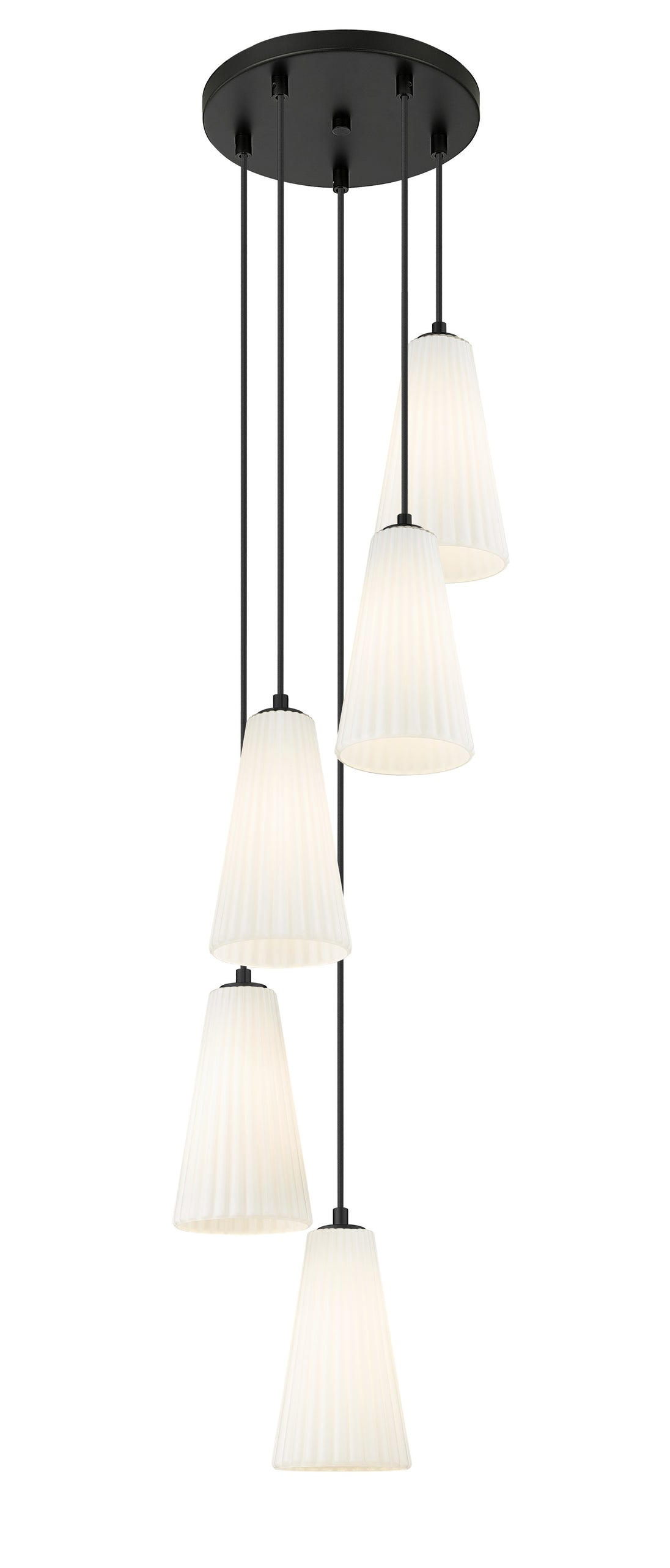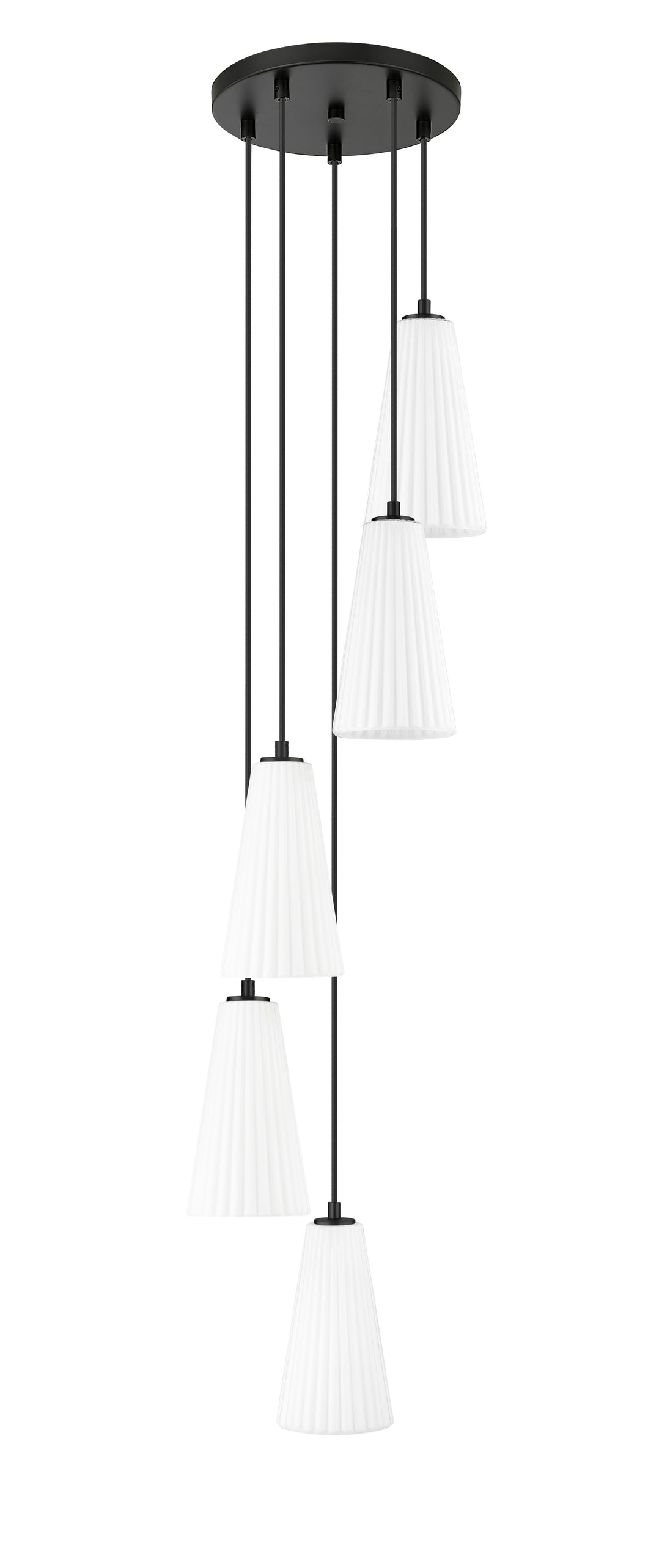 We love the delicate spiraling fall of elongated shades featured in this modern five-light chandelier. Stunning over a staircase or foyer, it's a gorgeous combination of fluted frosted glass shades and a matte black accent finish, creating a sophisticated presentation that brims with depth and texture.
