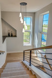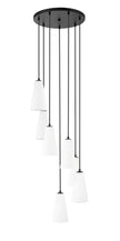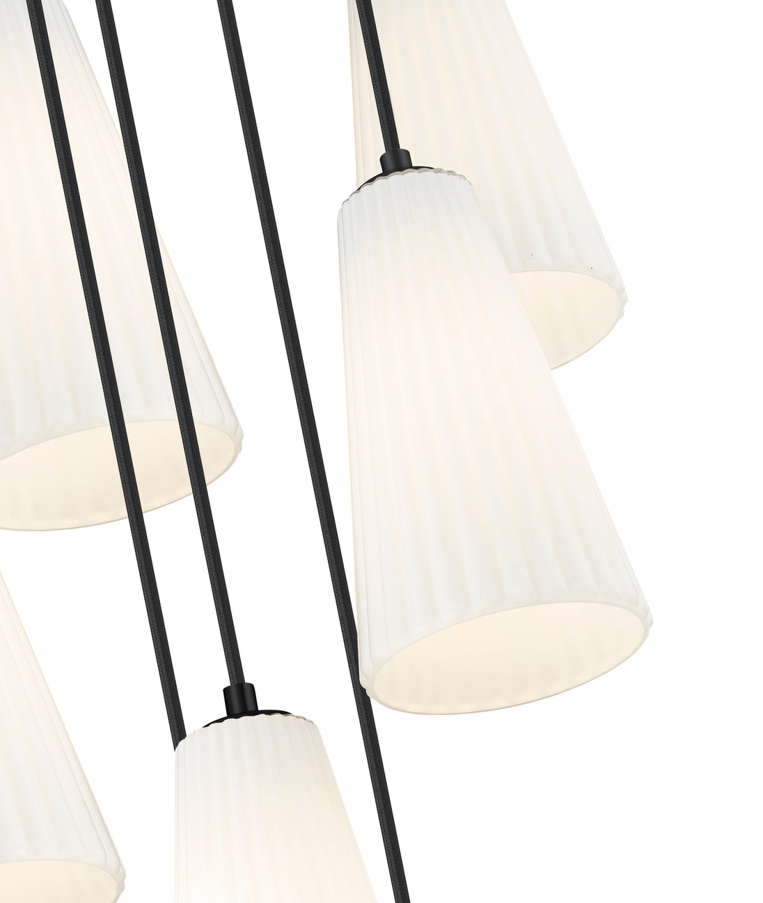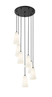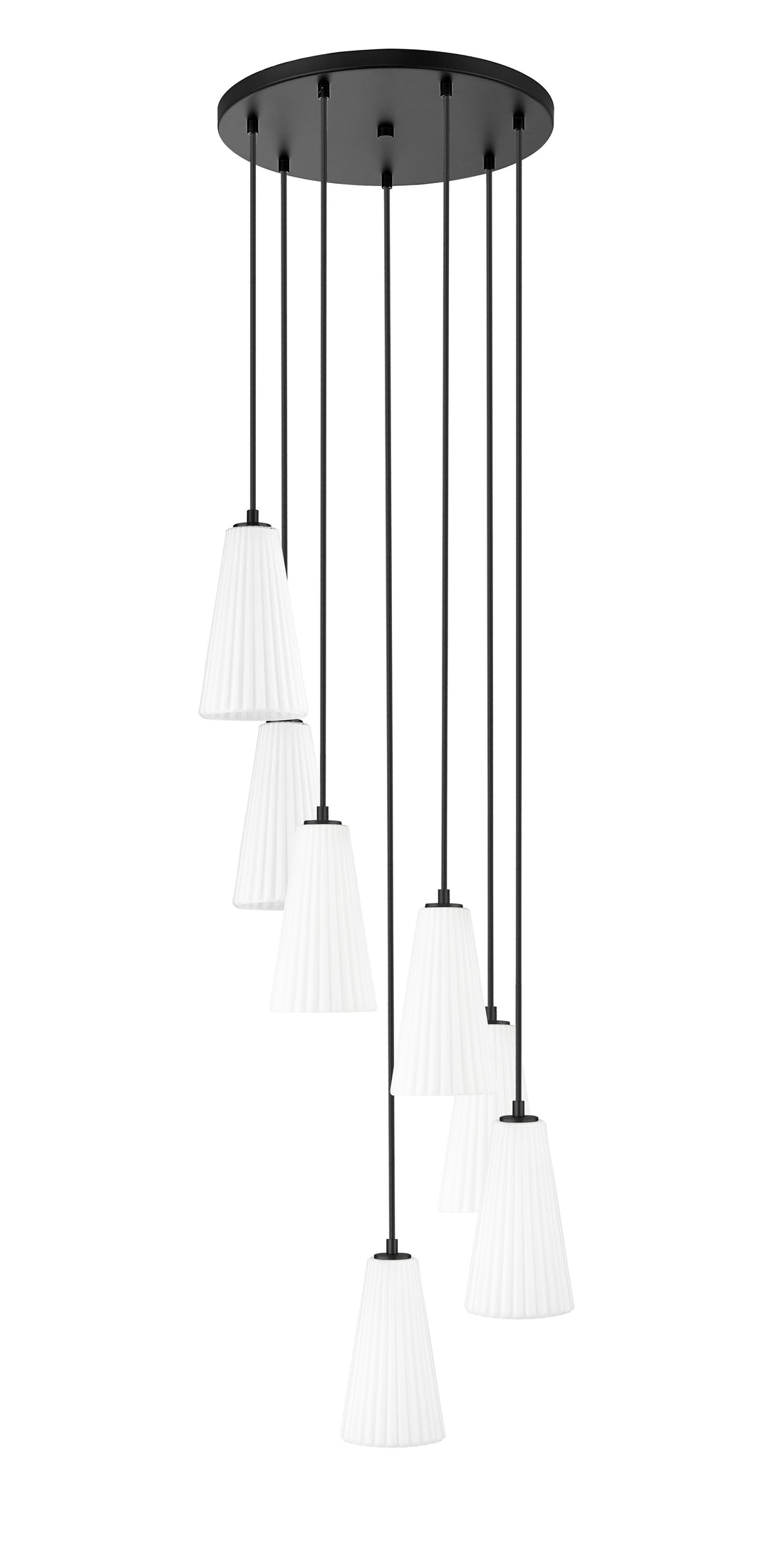 Put finishing touches on a sophisticated foyer or staircase with the delicate spiraling fall of lights in a modern seven-light chandelier. A striking combination of fluted frosted glass shades and a matte black finish creates a balance of strength and delicacy for this fixture, which sets the tone in any setting.