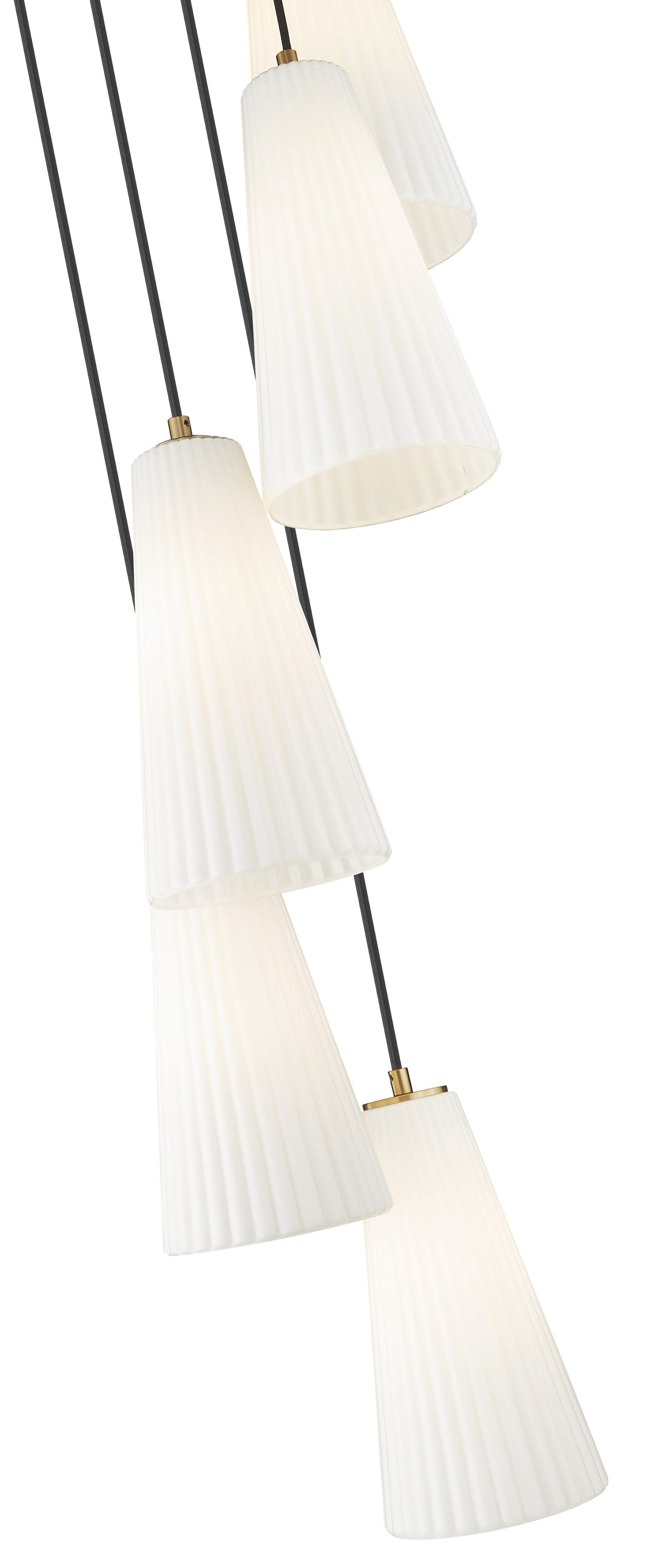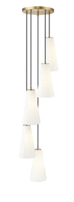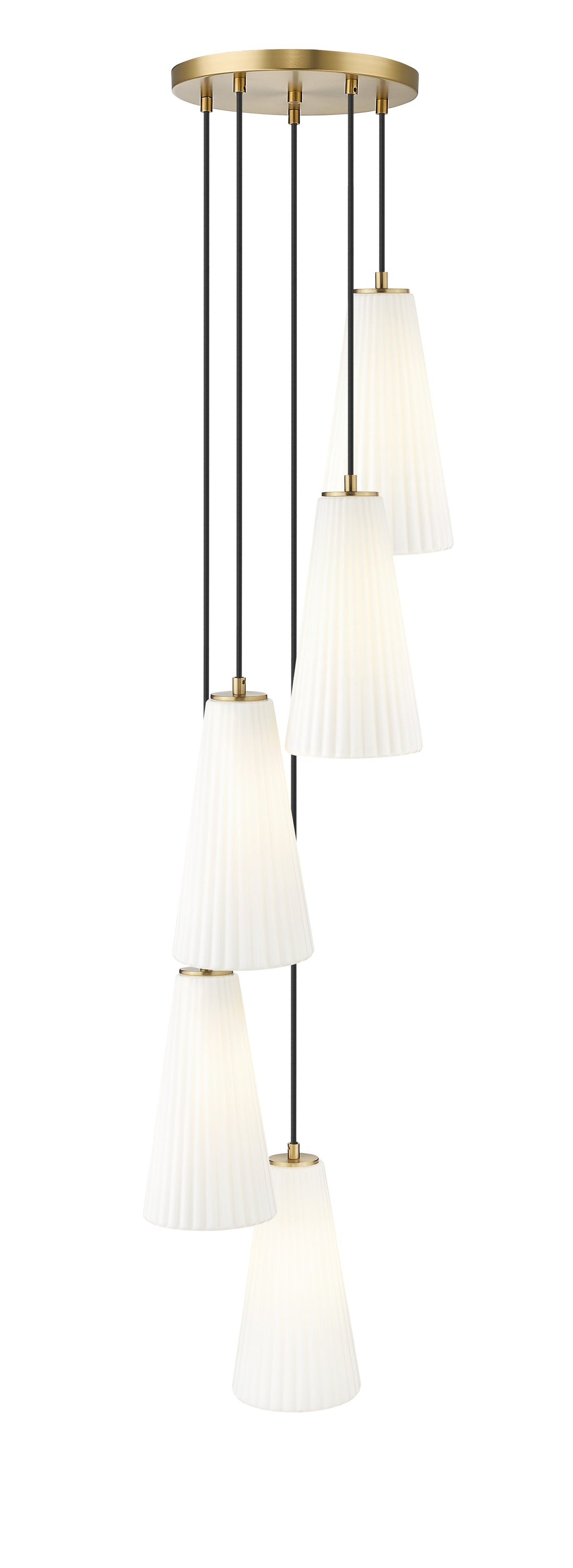 Delicate fluting adds refined energy and elegance to a modern five-light chandelier. Its spiral silhouette is a chic addition over a staircase or in a formal space, while a modern gold finish adds the perfect dose of warmth. Fluted glass shades are crafted in frosted glass, creating the perfect touch of softness.