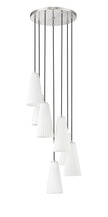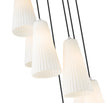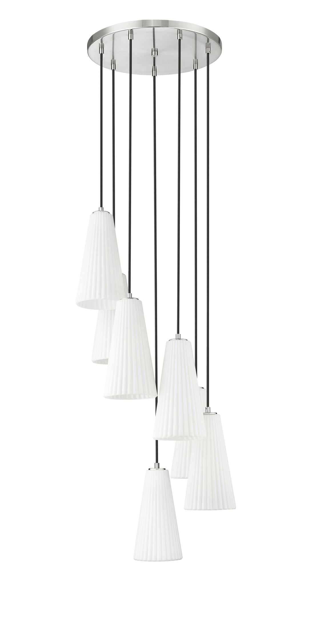 Spiraling suspension heights create the captivating silhouette of a modern seven-light chandelier. Gorgeous over a staircase or statement foyer, it features delicately fluted white glass shades balanced with a brushed nickel finish canopy and black suspension cables that infuse a sense of sophisticated depth and dimensionality.