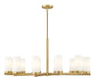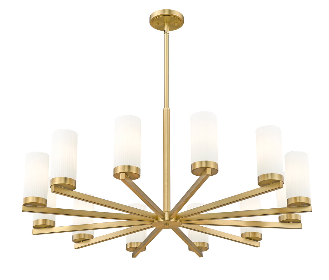 Straight radial arms host hurricane shades crafted in frosted white glass in a modern 12-light chandelier. Chic and warm in modern gold, the fixture creates a fresh but refined ambiance over a dining table or entryway.