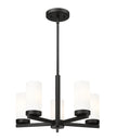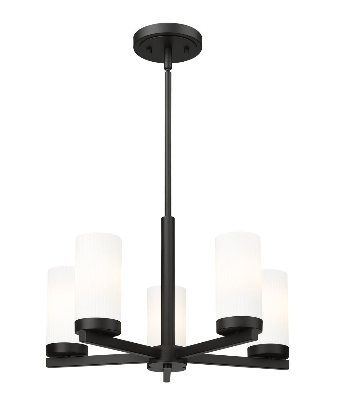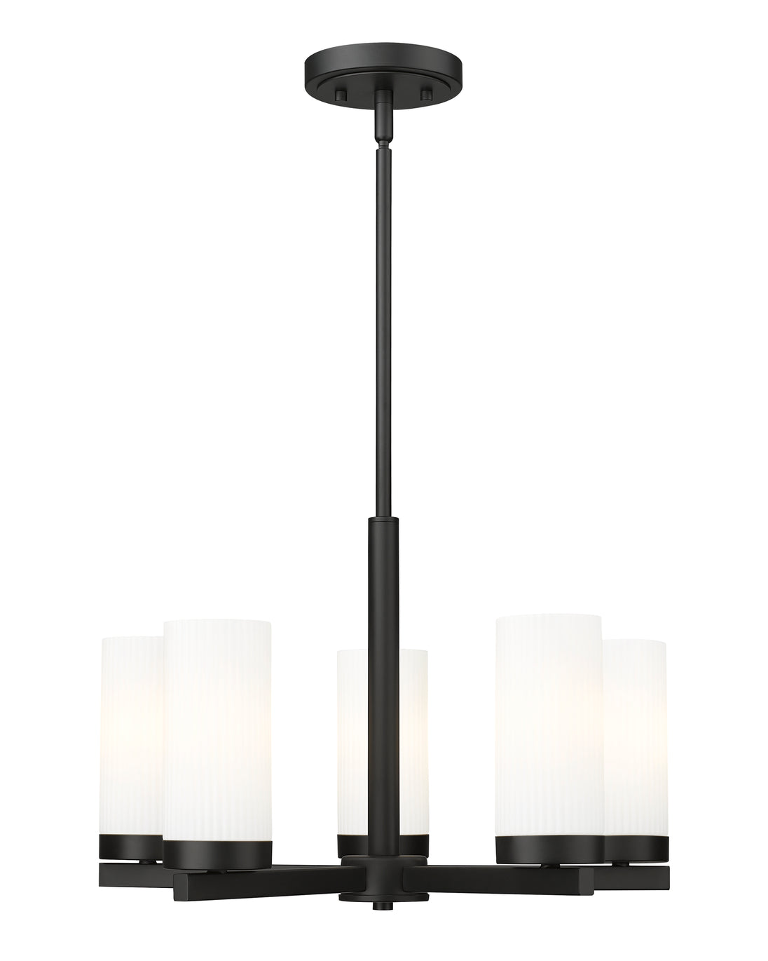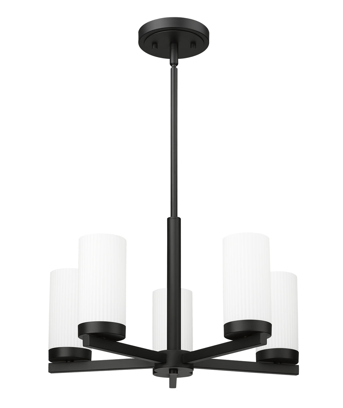 Radial arms create a compact profile for a modern five-light chandelier. Its fresh simplicity plays well in a variety of settings, from dining rooms to foyers and bedrooms. A rich matte black finish creates depth and contrast, while white glass cylinder shades create dimension and contrast while delivering excellent illumination for tasks and ambiance.
