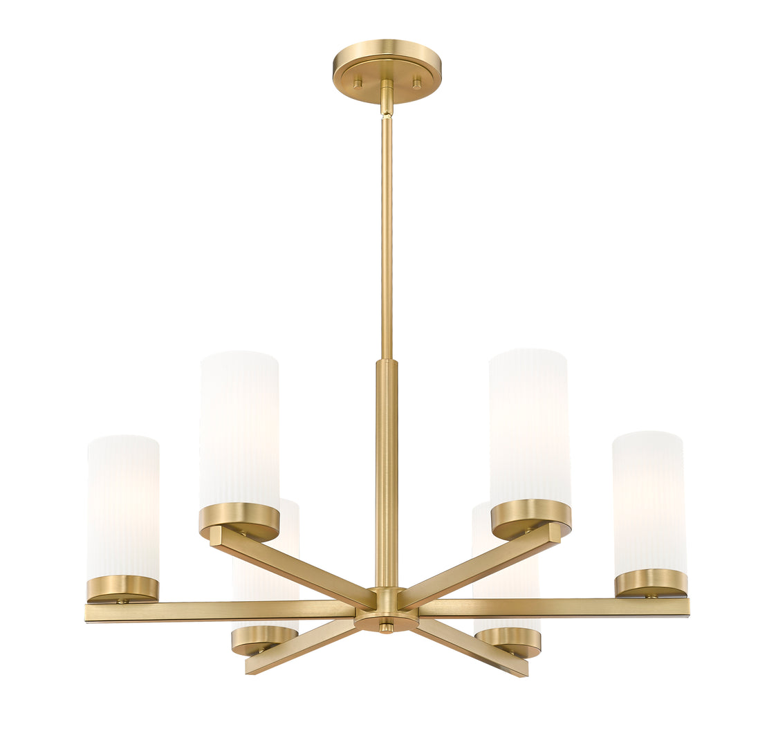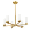 Rich in modern gold, this contemporary six-light chandelier is a chic choice for a stylish dining room or entryway. Radial arms cast wide illumination, while cylindrical shades of frosted glass diffuse illumination beautifully. It's the perfect upgrade for a revamped dining room.