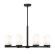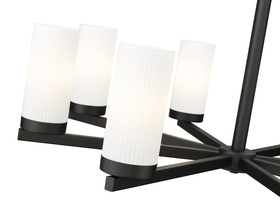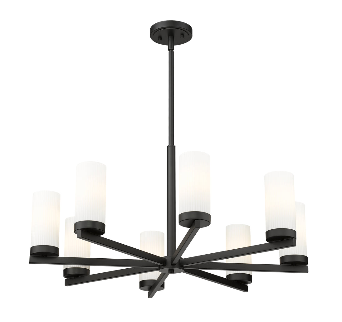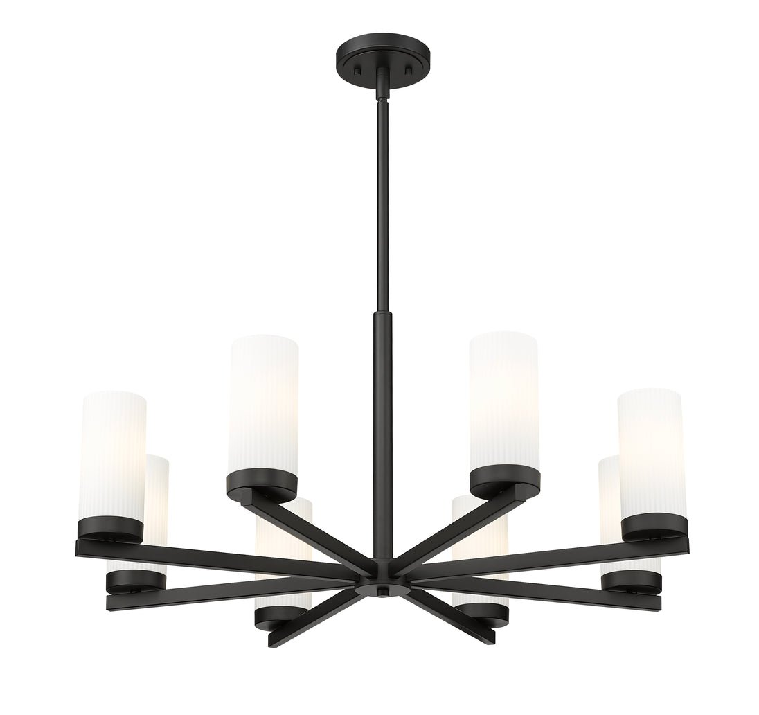 Sleek style infuses the compact profile of a modern eight-light chandelier. Radial arms are capped with cylinders of white glass while a matte black finish creates crisp contrast. A chic choice over a dining table or entryway, it sets an inviting tone with warm, inviting illumination.
